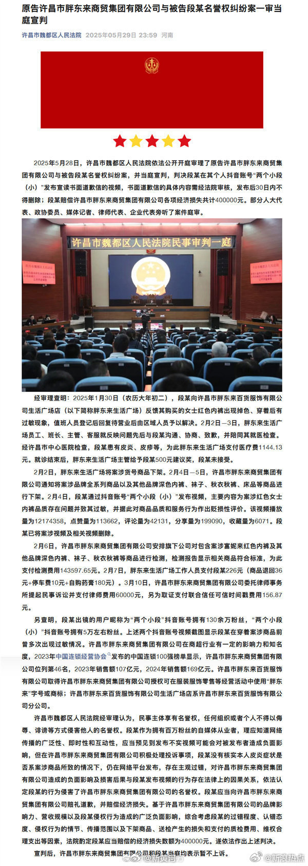 2025年5月28日,许昌市魏都区人民法院公开审理了胖东来与“红内裤”事件博主名誉纠纷案案,并当庭宣判,判决段某在其个人抖音账号“两个小段(小)”发布宣读书面道歉信的视频,30日内不得删除,并赔偿胖东来各项经济损失400000元。