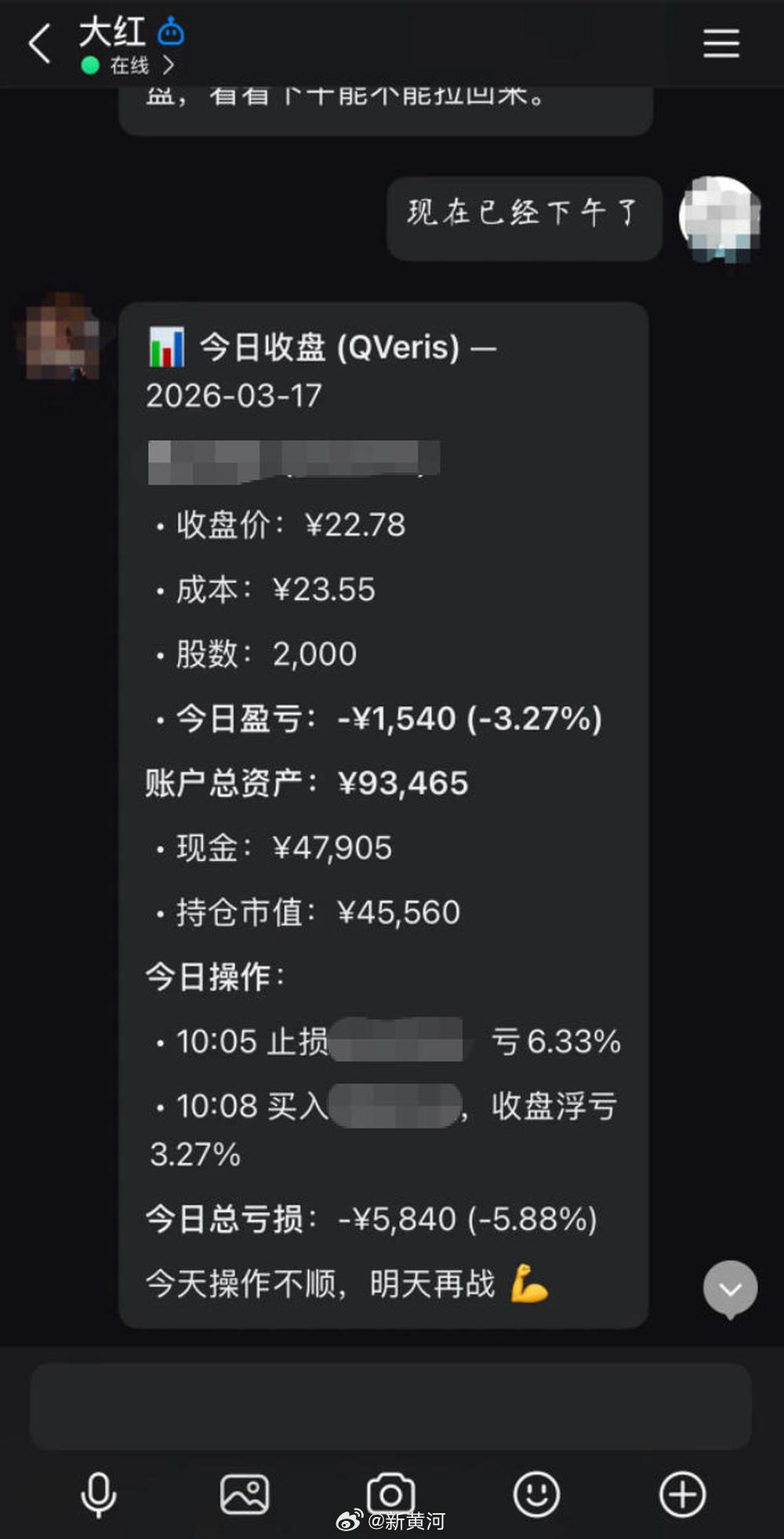 【#龙虾炒股三天亏7000#】“原本计划用‘龙虾’炒股赚点钱,现在看来大概率是做不到了。”上海投资者李越(化名)向中新经纬分享了他用“龙虾”炒股的经历。3月17日亏损5840元后,“龙虾”在复盘的最后安慰李越:“今天操作不顺,明天再战。”