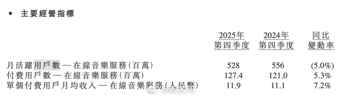 这场暴跌发生在腾讯音乐发布2025年第四季度及全年财报之后,亮丽的业绩数据与低迷的市场反应形成强烈反差。财报提到,从下一季度开始停止按季度披露在线音乐的月活跃用户数、付费用户数和单个付费用户平均收入,改为每年年末仅披露总付费用户数。