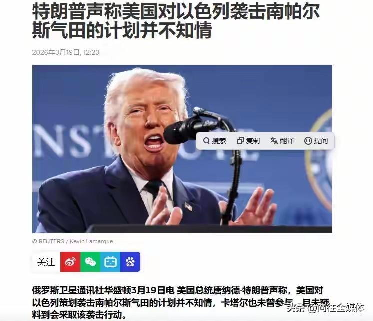 面对失控局势,特朗普态度急转,公开宣称美国对以军行动毫不知情,与以色列迅速切割。一方面出于商人算计,担心战火扩大损害美国利益;另一方面又不甘心放弃中东布局,随即发出强硬威胁,警告伊朗不得再攻击卡塔尔,否则将彻底摧毁南帕尔斯气田。