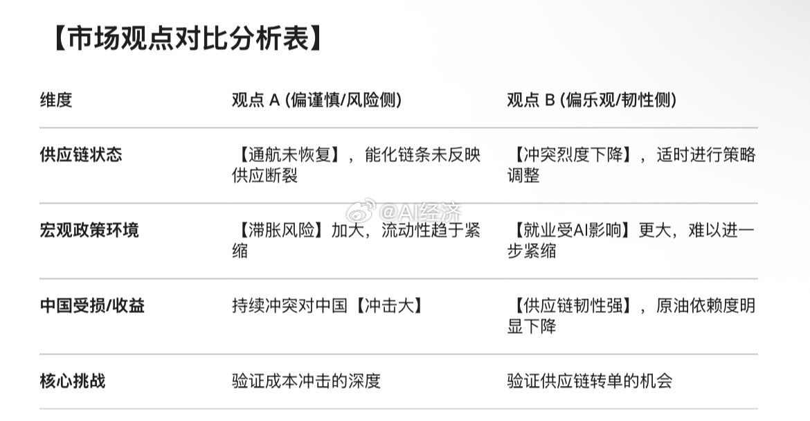 【伊朗冲突走向与市场影响深度梳理报告】via:曹山石 四大看法冲突 图三一、 【市场预期的三大显著分歧】 * 冲突烈度与供应链恢复的分歧: (a) 乐观预期: 认为【冲突烈度下降】,应适时进行【TACO】(注:此处可能指特定交易策略或操作)。 (b) 忧虑观点: 强调【通航还未恢复】,认为目前的能化链条价格尚未真正反映出【供应断裂】的风险。 * 宏观经济风险与货币政策的争论: (a) 紧缩预期: 担忧【滞胀风险明显加大】,导致【流动性趋于紧缩】。 (b) AI影响论: 认为【就业前景受AI影响更大】,就业压力使得货币政策【难以紧缩】。 * 对中国经济影响的两种观点: (a) 冲击论: 认为冲突如果【持续下去】,对中国的经济【冲击大】。 (b) 韧性论: 强调【中国供应链韧性强】,且【原油依赖度明显下降】,具备较强的抗风险能力。二、 【驱动不同判断的三大核心待验证问题】 * 航运恢复程度: 在【冲突烈度下降】后,全球【通航】究竟能够恢复到什么程度,目前尚无法验证。 * 美联储决策偏好: 面对复杂局势,【美联储】的决策天平是更看重【表征通胀指标】,还是更关心【实际的就业情况】。 * 中国经济的性质定义: 中国目前所处的环境,究竟是面临严峻的【成本冲击】,还是存在【供应链转单】的增长机会。三、 【关键时间窗口预判】 * 明朗化节点: 报告指出,上述所有核心问题和市场分歧,可能只有到了【4月】才能逐步明朗并得到答案。【内容核心金句】 * : “伊朗冲突的走向与市场影响存在巨大的【预期分歧】。” * : “能化链条尚未真正反映【供应断裂】。” * : “就业前景受【AI影响】更大,难以紧缩。” * : “不同判断的背后,有三个核心问题目前【无法验证】,难有答案。” * : “这些问题可能只有到了【4月】才能逐步明朗。”金价大跌没人扫货了