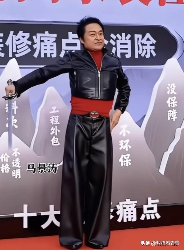 都说红配黑是绝配,可是马景涛这一身着实有些不太好看,皮衣只在肚子以上,感觉小了好几码,皮裤还配了一双尖头皮鞋,着实有点独特。