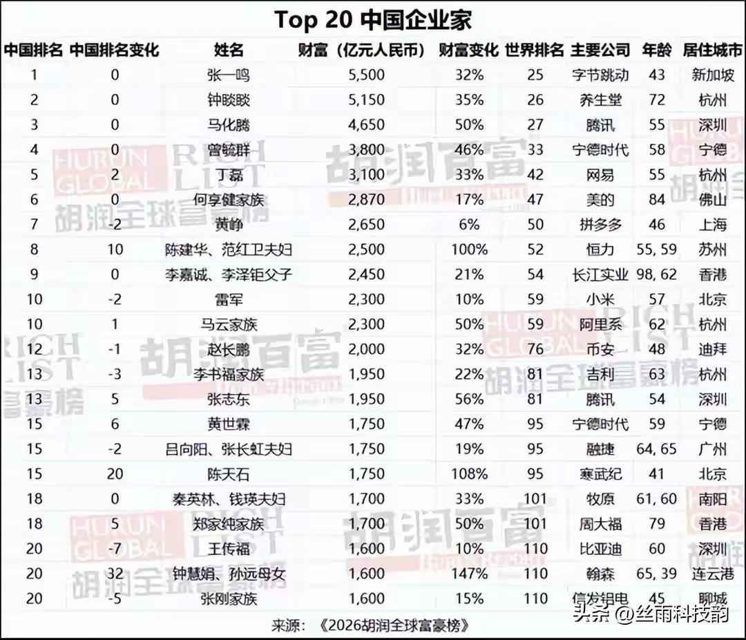 科技圈从来不缺富豪,2026胡润中国富豪排行榜,结果一点不意外,43岁的张一鸣又拿第一了,身价直接干到5500亿,第二名钟睒睒5150亿,小马哥马化腾4650亿 。而且张一鸣这次身价比去年涨了1300多亿。 说实话,以前总觉得富豪离自己很远,可看着张一鸣的身家,再想想自己每天刷抖音,没事逛直播间买东西,才发现我们的生活早就被字节跳动包围了。从短视频火遍全国,到直播带货改变消费习惯,字节跳动每次都精准踩中风口,张一鸣能坐稳首富,真不是靠运气。 钟睒睒靠一瓶农夫山泉稳居第二,靠的是实打实的民生刚需;马化腾的腾讯陪伴了几代人的青春,社交、游戏样样精通,三位大佬各有各的厉害。 看完这份榜单,我最大的感受不是羡慕,而是觉得时代真的变了。年轻的科技创业者靠着创新一路领跑,老牌实业家和互联网巨头也牢牢守住阵地,没有谁能轻易被取代。 这榜单看着是数字的比拼,实则是时代风口和个人眼光的较量,能抓住机遇的人,终究会站在高处,你们觉得呢?