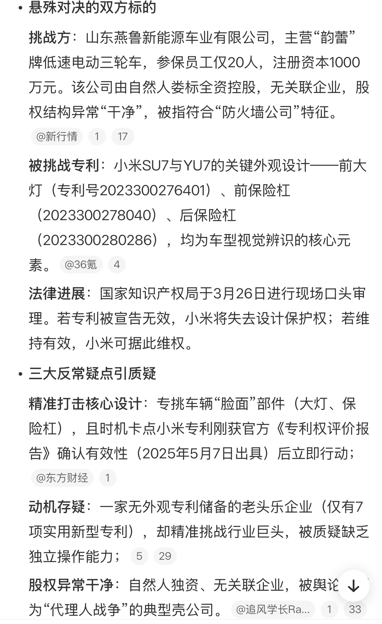 有点意思,一家非常小的老头乐公司,居然去告小米侵权业内的汽车博主把这个形容为:代理人战争也就是说,赢了那就赚大了,输了也无所谓反正是一家小公司,还能恶心恶心小米3月26号就能有结果,等等看……