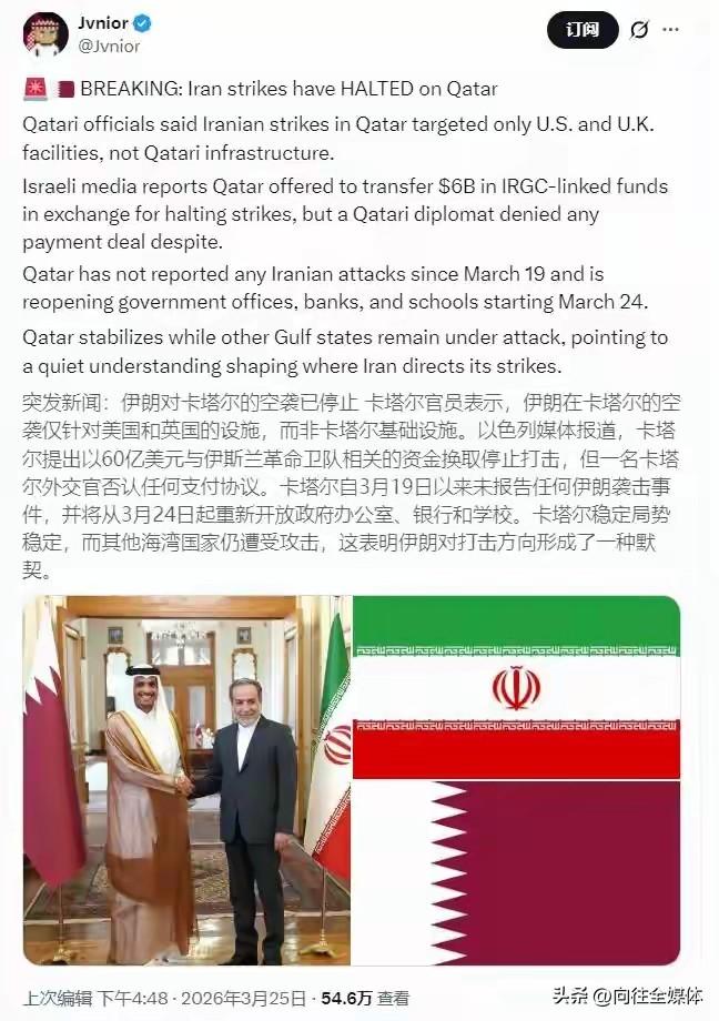 近期中东局势突变,一则卡塔尔向伊朗支付60亿美元保护费的消息引爆舆论。尽管卡塔尔官方紧急否认,但自3月19日后,伊朗确实停止了对卡塔尔的所有打击,当地政府、学校、银行逐步恢复正常,这一反常现象让外界普遍相信双方达成了秘密交易。