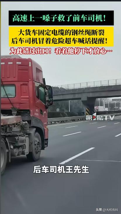信息来源:《高速上一嗓子救了前车司机!沪昆高速浙江嘉兴段,前方半挂车上固定电缆的钢丝绳突然断裂,几十吨重的货物随时可能脱落。紧急时刻,后车司机一路鸣笛提醒……》第1眼新闻
