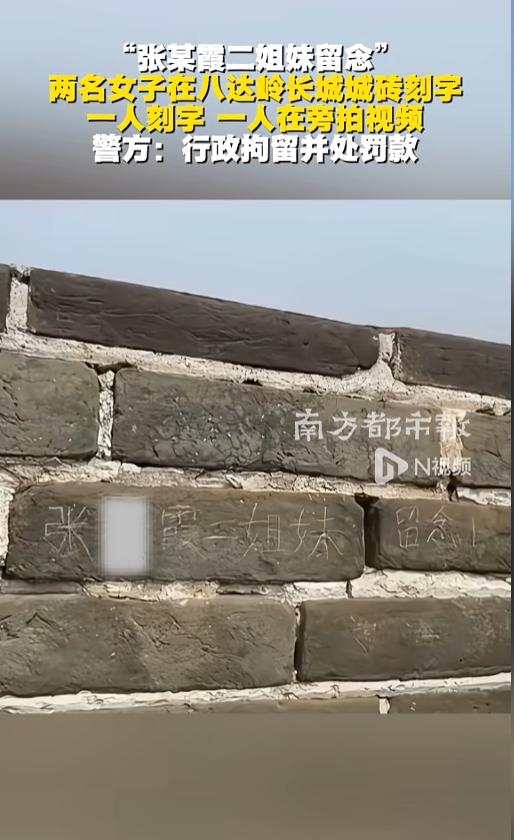 信息来源:《“张某霞二姐妹留念” 两名女子在八达岭长城城砖刻字 一人刻字 一人在旁拍视频 警方:行政拘留并处罚款