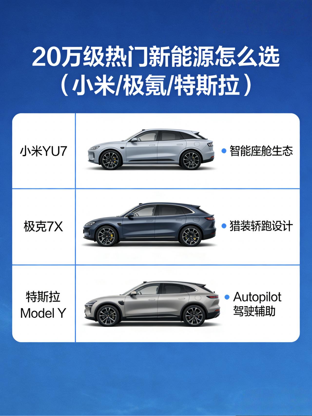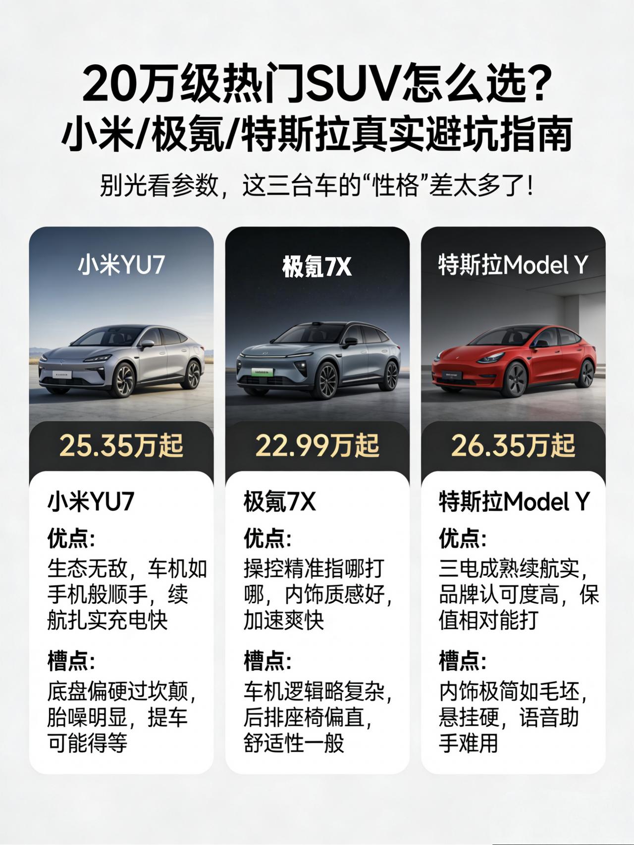 20万级热门新能源怎么选(小米/极氪/特斯拉) 最近陪朋友看20多万的新能源SUV,发现现在的选择真是“幸福的烦恼”。如果你也在纠结,不妨听听我这半个月跑店试驾的真实感受,主打一个“人无完人”。 1. 小米YU7:年轻人的第一台“显眼包” 这车现在热度是真的高,店里看车的全是年轻人。优点很直白:车机流畅得跟手机一样,生态互联对米粉是绝杀;空间比想象中大,后排地台全平。但槽点也很真实:底盘调校偏硬,过减速带有点颠,胎噪在80码以上比较明显。个人建议:如果你追求科技感、爱折腾智能家居,且能接受偏运动的驾乘感,闭眼入;但如果是给家里老人买或者追求极致舒适,建议再想想。 2. 极氪7X:操控党的“心头好” 极氪的驾驶质感确实名不虚传,转向精准,加速不窜。优点:操控同级领先,内饰用料扎实,没有塑料感。槽点:车机虽然不卡,但逻辑有点复杂,不如小米直观;后排座椅角度有点直,长途乘坐舒适性一般。适合人群:对驾驶乐趣有要求,喜欢开车的人,而不是把车纯粹当代步工具。 3. 特斯拉Model Y:稳妥的“老钱”选择 虽然被戏称“毛坯房”,但销量说明一切。优点:三电系统成熟,续航扎实,保值率相对能打,品牌认可度高。槽点:内饰极简到简陋,悬挂硬得怀疑人生,语音助手像个“人工智障”。适合人群:对品牌有要求,有长途高速需求,且不想在选车上花太多心思的“怕麻烦星人”。 最后说句大实话:这三台车没有绝对的好坏。要好玩、要生态选小米;要好开、要质感选极氪;要稳妥、要品牌选特斯拉。建议别光看评测,自己去试一圈,屁股比眼睛更会选车。【来自懂车帝车友圈】