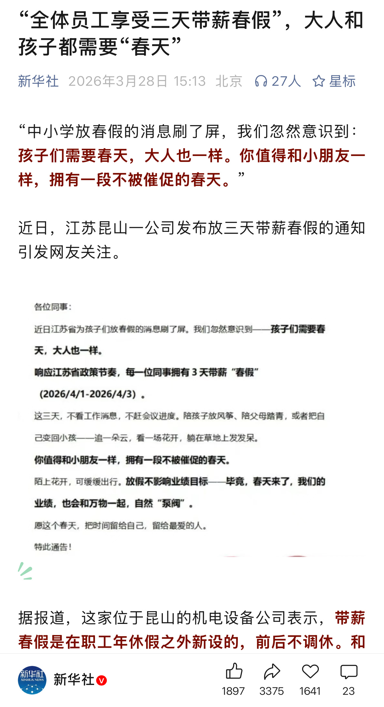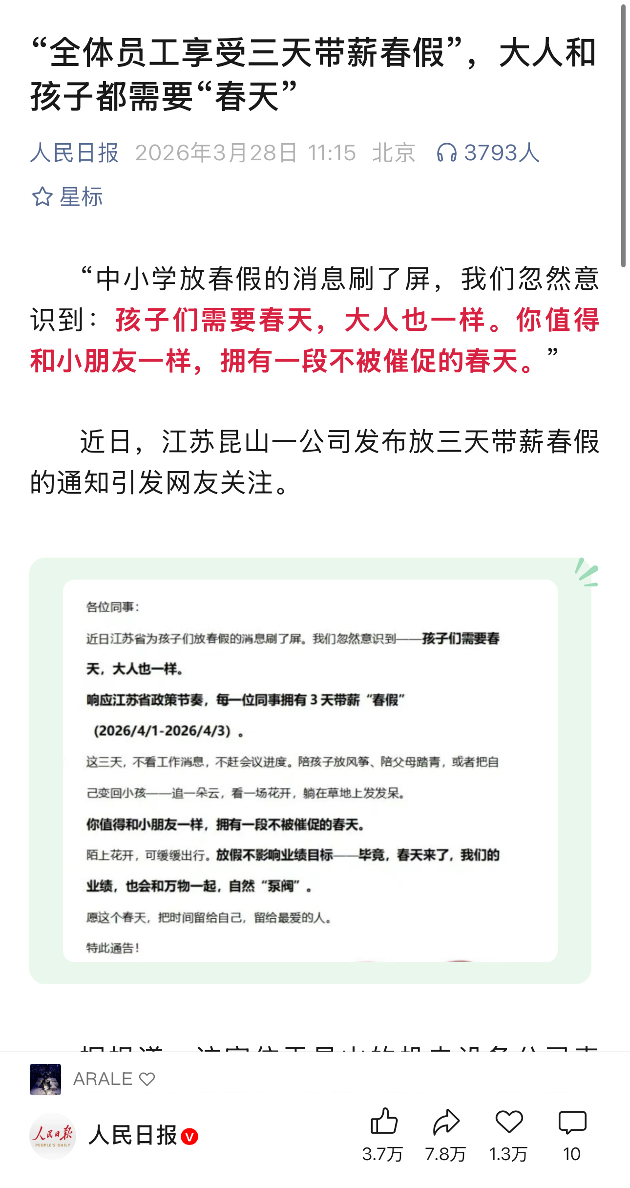 多放三天员工春假,就能得到人民日报、新华社和央视新闻等一众媒体的全面报道,也是用