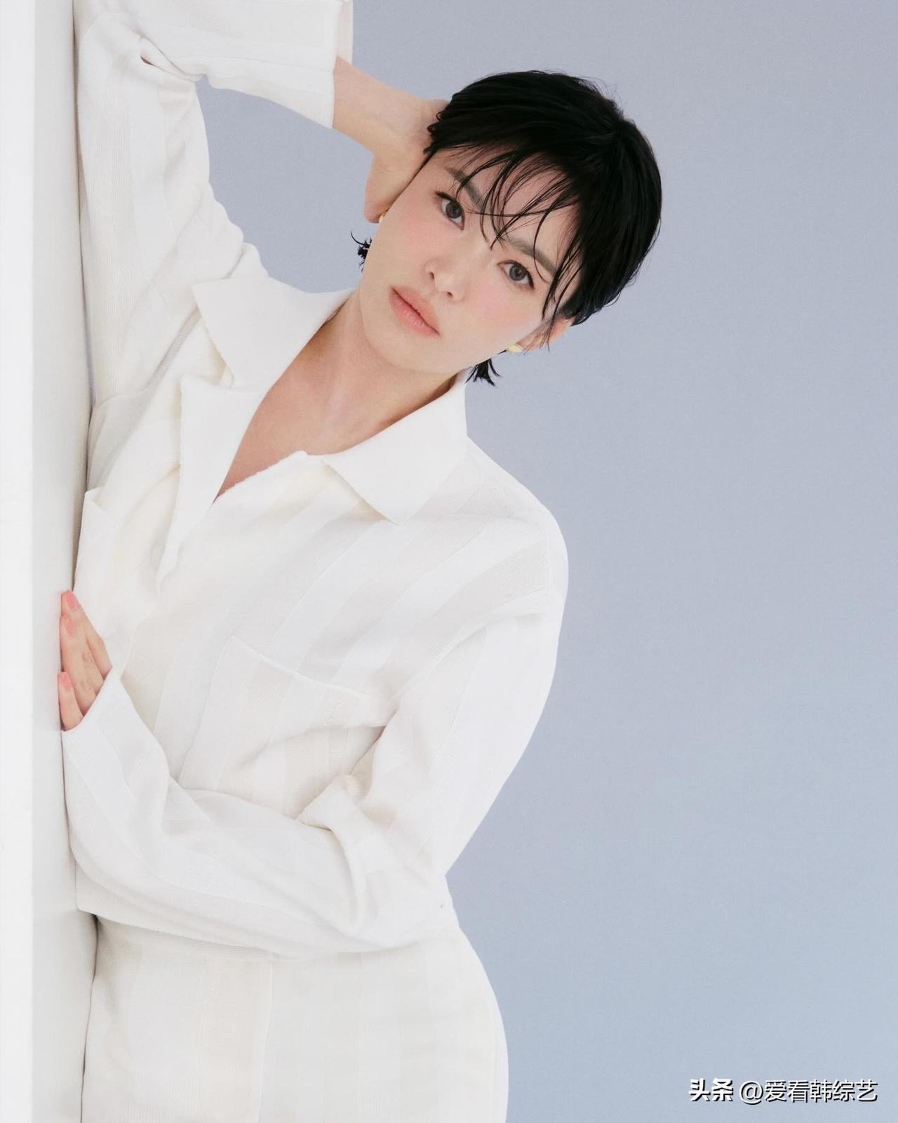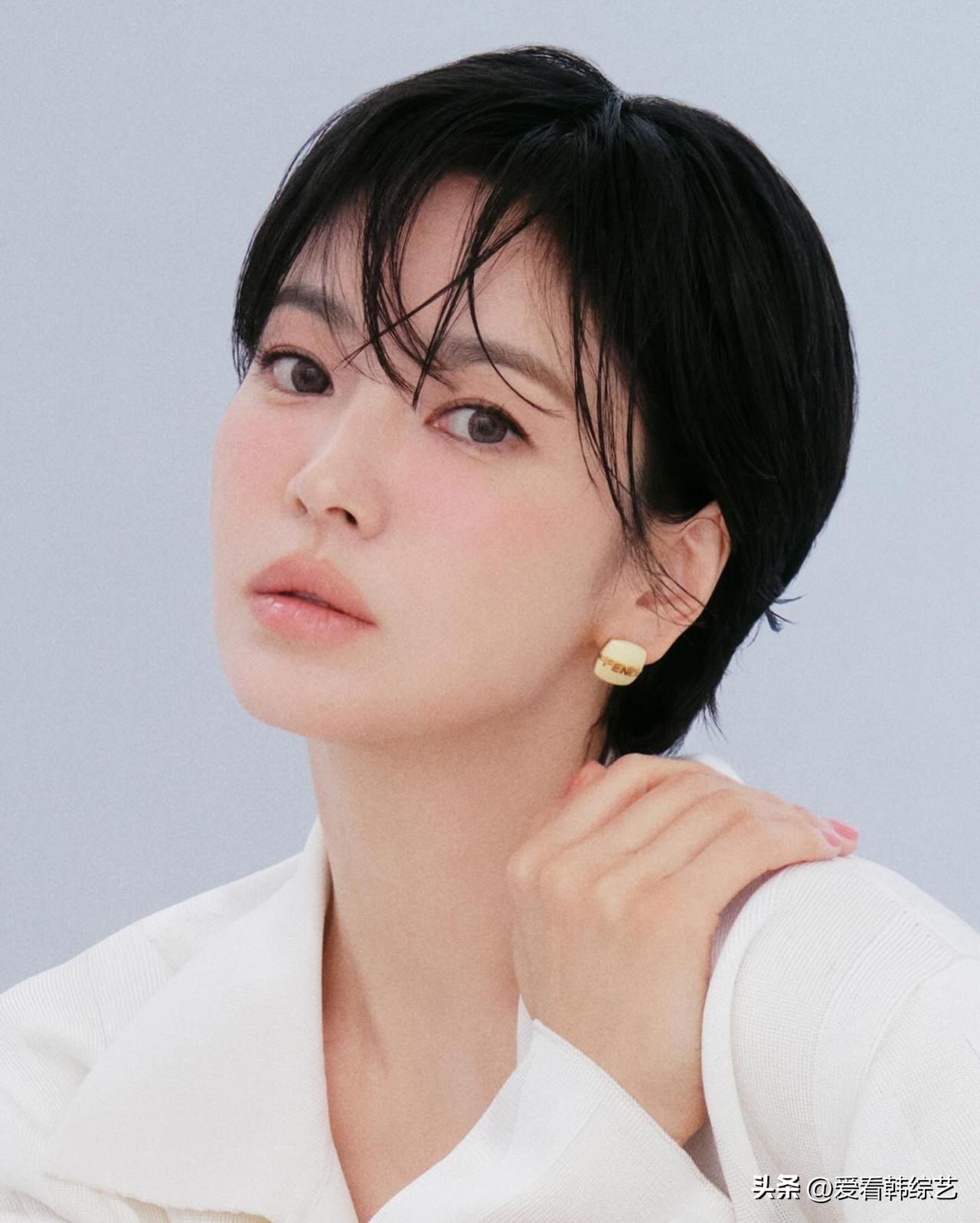 值得一提的是,宋慧乔以短发搭配淡粉色腮红,散发出优雅而神秘的气质。