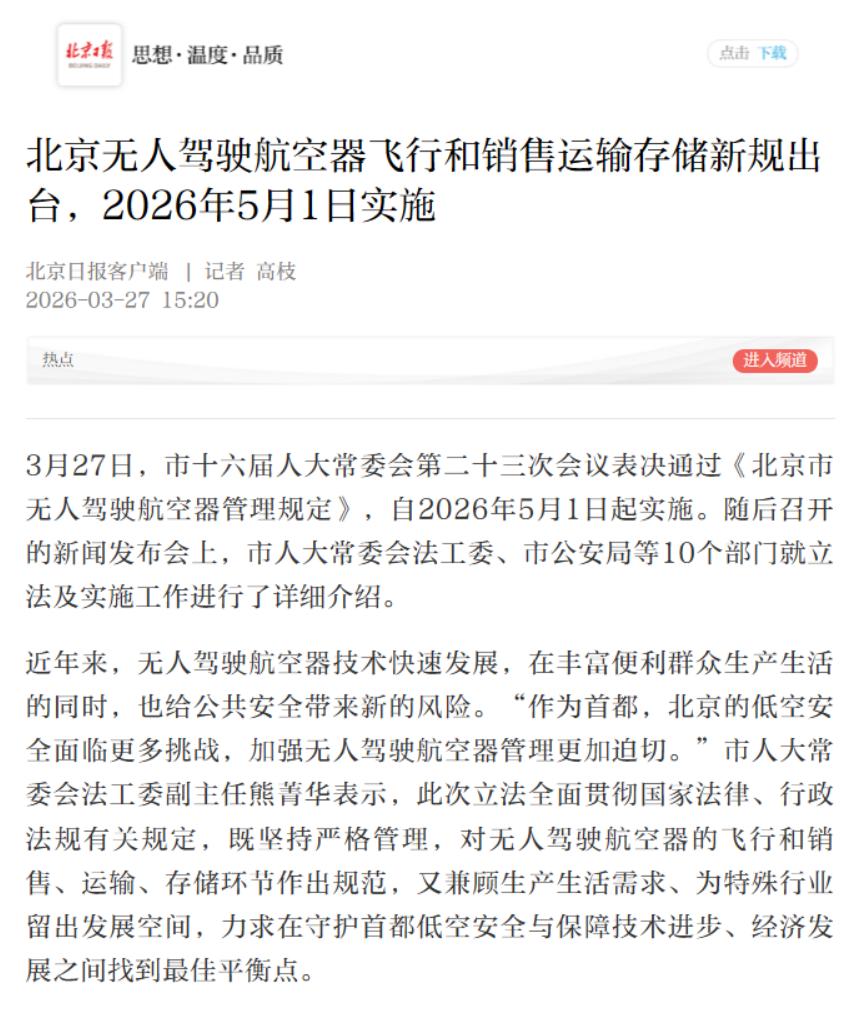 北京无人机玩家注意了!史上最严新规落地——《北京市无人驾驶航空器管理规定》将于2026年5月1日实施!核心就一个字:严!🚫