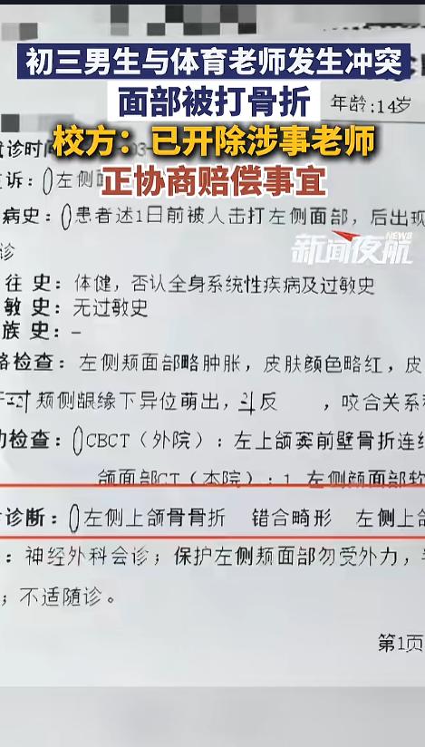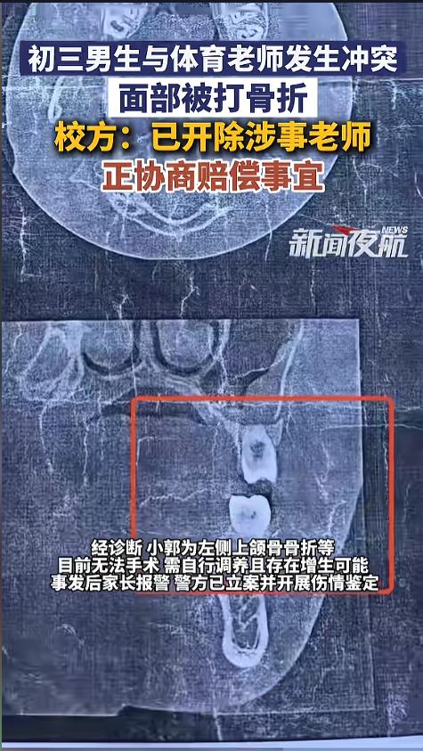 信息来源:《3月27日(发布),初三男生与体育老师发生冲突,面部被打骨折,校方:已开除涉事老师,正协商赔偿事宜。》新闻夜航