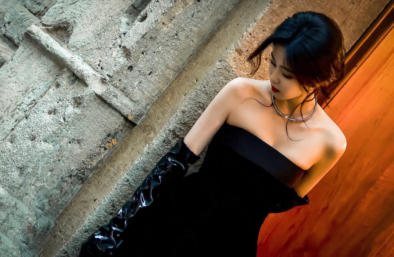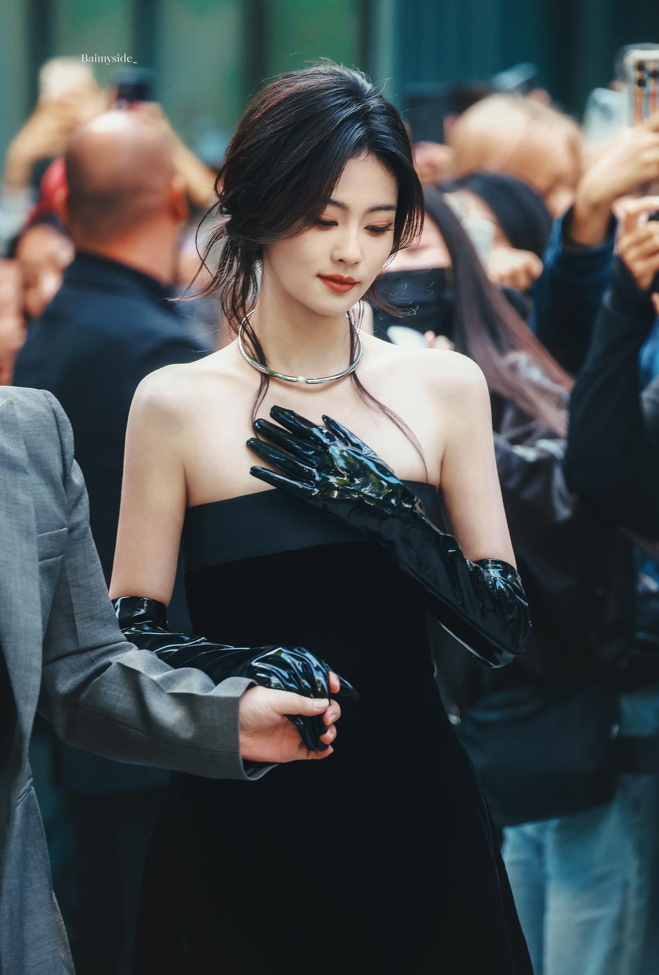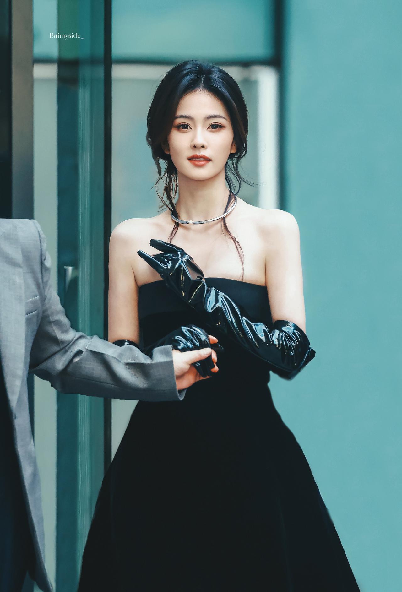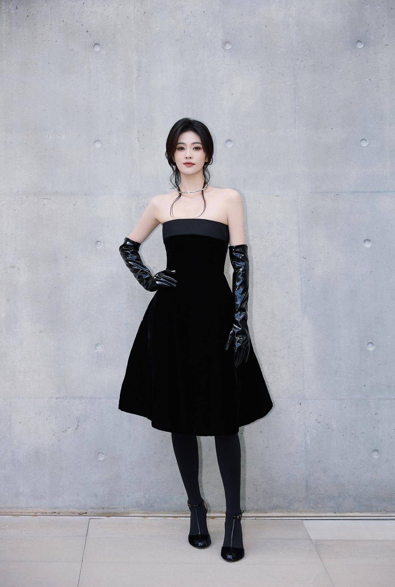 白鹿裹胸黑裙 黑色过膝手套 黑色丝袜大长腿 黑色半包细高跟 身材真好