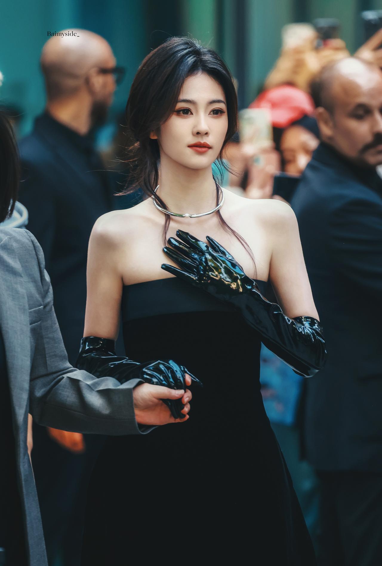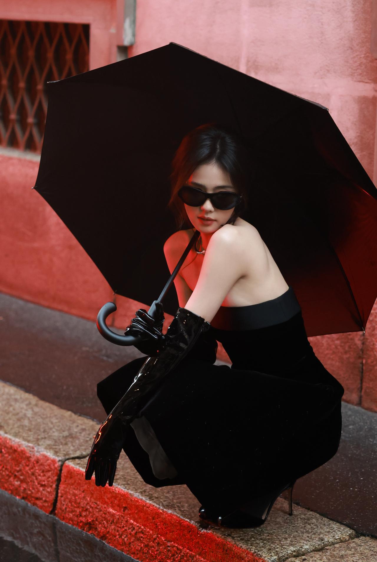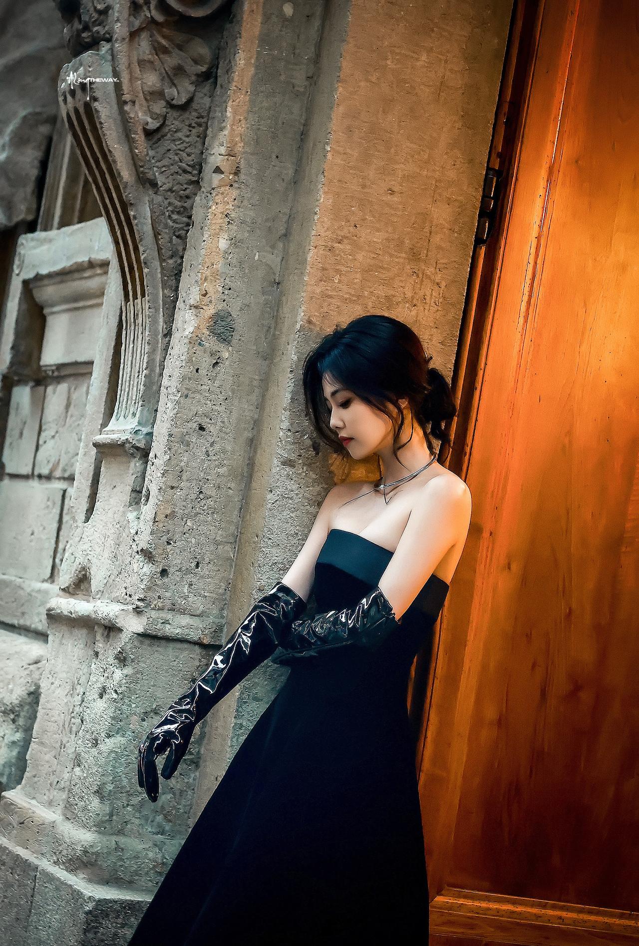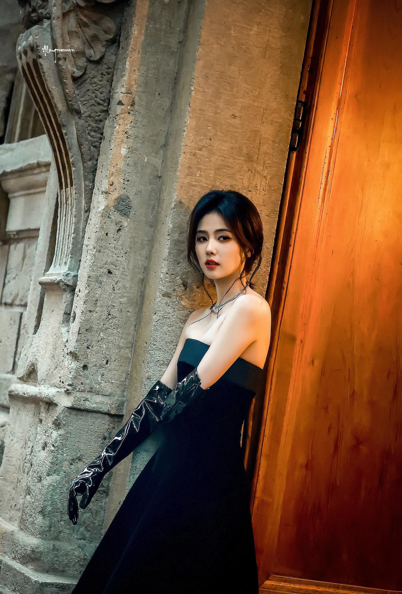 白鹿裹胸黑裙 黑色过膝手套 黑色丝袜大长腿 黑色半包细高跟 身材真好