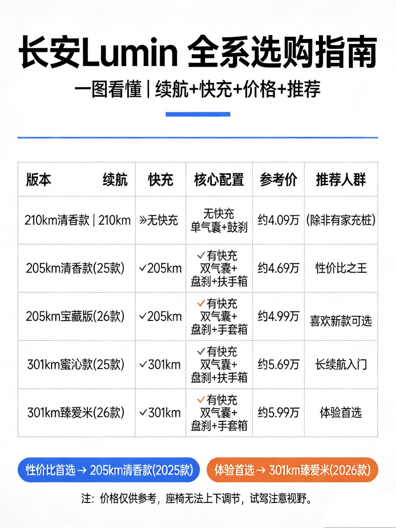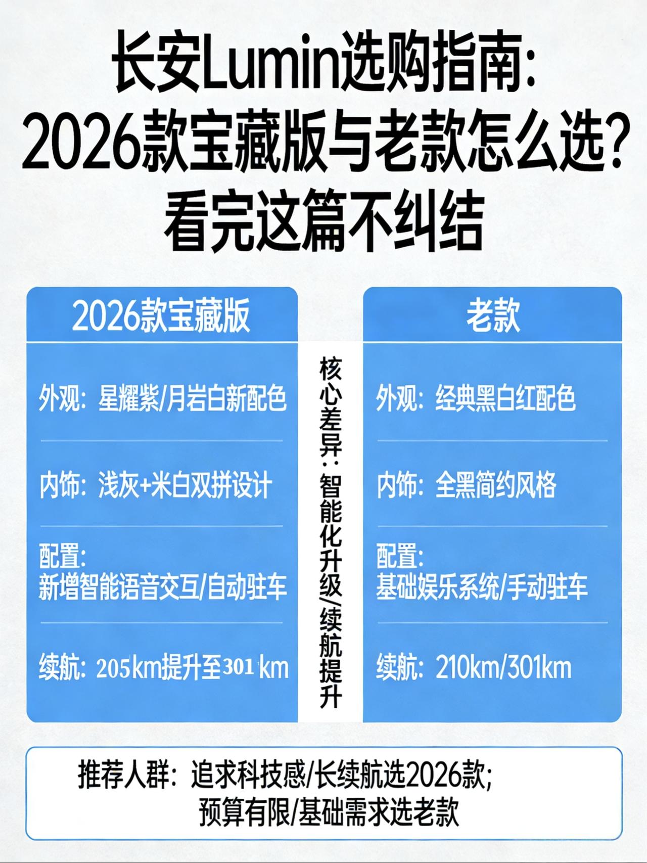 长安Lumin选购指南:2026款宝藏版与老款怎么选?看完这篇不纠结 在5万级的纯电微型车市场,长安Lumin(糯玉米)凭借其呆萌的“熊猫眼”设计和越级的车身宽度,一直是不少家庭代步的首选。随着2026款“宝藏版”的上市,现在市面上同时存在着2025款和2026款,配置繁多,价格从4万多到6万不等。 很多粉丝在后台问我:到底买哪个版本性价比最高?带快充的真的有必要吗?今天我就结合最新的行情和配置差异,为你整理一份保姆级的选买攻略。 一、核心差异解析:2026款“宝藏版”变了什么? 在深入版本之前,我们先得搞清楚2026款相比2025款到底改了什么。这次改款并非简单的“年度款”,而是在设计和实用性上做了明显的调整: 1.外观微调:2026款取消了之前的“笑脸”中网,改为封闭式面板加独立灯组,看起来更简洁,轮毂也换成了十字纹。颜值见仁见智,但新鲜感是有了。 2.内饰储物大换血:这是争议最大的一点。2026款取消了前排中央扶手箱,改为了手套箱。对于习惯手肘有支撑的朋友来说,这绝对是个减分项;但对于需要更多储物空间(如行驶证、墨镜)的用户,手套箱确实更实用。 3.细节优化:针对老款车主吐槽较多的隐藏式门把手弹出不畅问题,2026款进行了机构优化,使用体验会更好。 二、版本配置深度解读:谁才是性价比之王? 目前的在售车型主要分为210km、205km和301km三个续航梯队,我们逐一分析。 1. 入门级:210km 清香款(2025款) 这是目前的最低配车型,价格最诱人(约4.49万起)。但它不支持快充,且只有主驾驶气囊,后轮还是鼓刹。 购买建议:强烈不推荐,除非你家里有固定充电桩,且只在村里或封闭园区代步。没有快充意味着一旦电量告急,你只能对着插座发愁,这在日常使用中限制太大。 2. 走量级:205km 清香款/宝藏版(2025款/2026款) 这个版本最大的升级就是增加了快充功能,这是Lumin从“老头乐升级版”变成“正经代步车”的分水岭。30%-80%充电仅需35分钟左右。 👉选2025款(约4.69万):如果你预算吃紧,且喜欢有中央扶手的设计,老款性价比极高。 选2026款宝藏版(约4.99万):如果你能接受没有扶手箱,且想要更好用的门把手和更时尚的外观,多花3000元是值得的。 3. 长续航级:301km 蜜沁款/臻爱米(2025款/2026款) 这是我最推荐的版本。电池容量提升,CLTC续航达到301km,实际市区跑个200多公里问题不大。更重要的是,这个版本通常配备了更完善的舒适性配置。 👉选购分歧:同样看你对“扶手箱”和“手套箱”的偏好,以及对外观新旧的喜好。 三、避坑指南:关于电池供应商 这是一个很容易被忽略的细节。长安Lumin的电池供应商主要有宁德时代和国轩高科。 北方用户(如东北、西北):建议优先寻找搭载宁德时代电池的版本。虽然都是磷酸铁锂,但宁德时代的低温性能和一致性在业内口碑更好,冬天续航达成率会更有保障。 南方用户(如广东、福建):两地差异不大,国轩高科版本通常性价比更高,可以放心入手。 四、一句话总结:按场景选版本 为了方便你快速决策,我把不同版本对应的人群和场景整理如下: 预算极紧、有家充桩、只在老家代步:选 210km清香款。理由:最便宜,但续航和快充是硬伤。 城市通勤、预算有限、想要性价比:选 2025款 205km清香款【来自懂车帝车友圈】