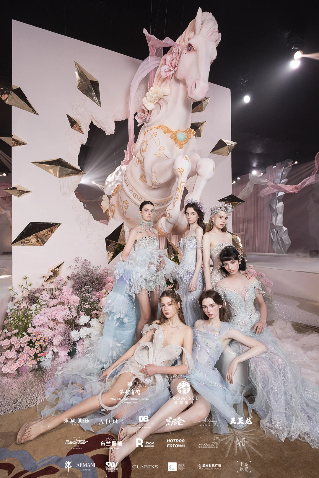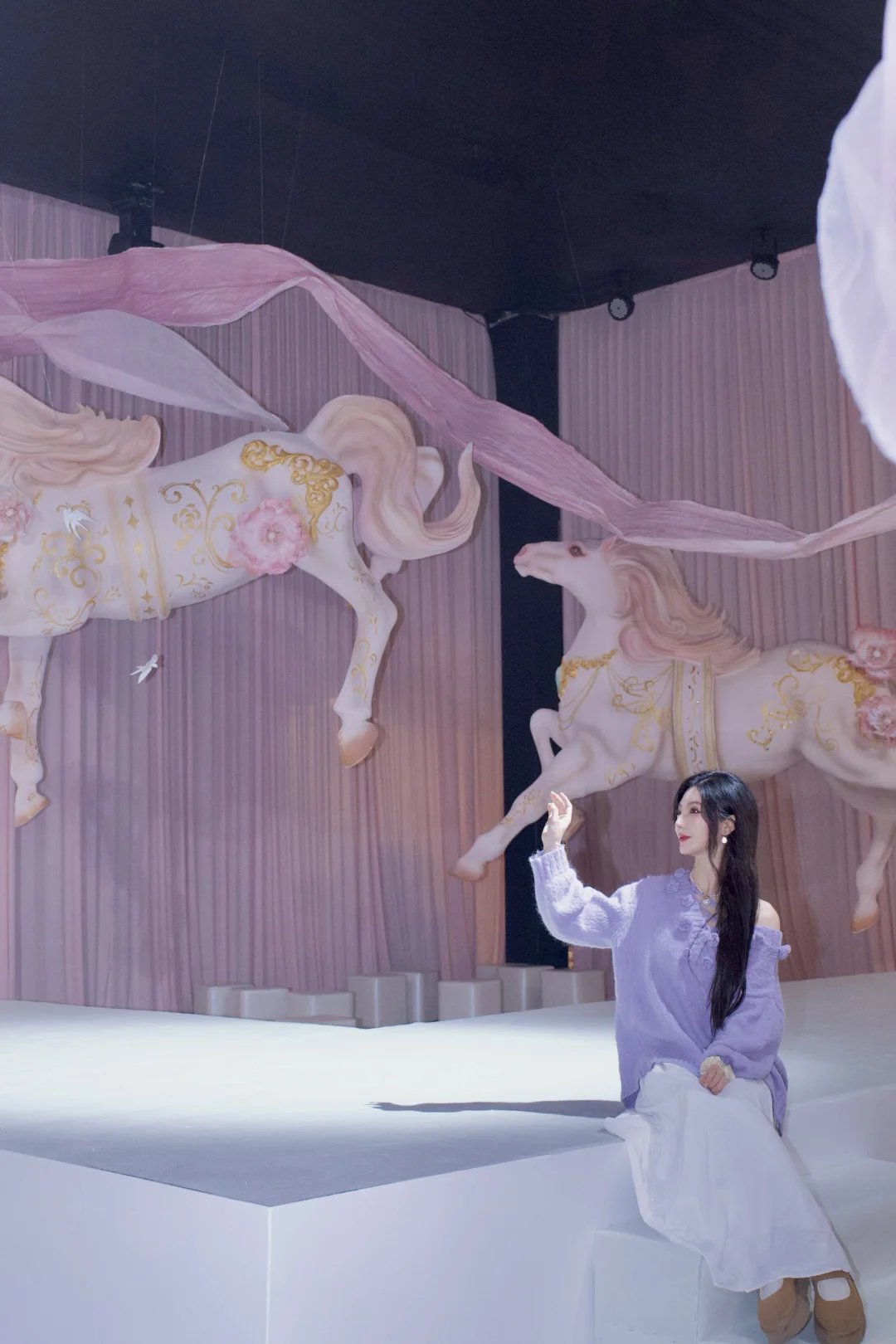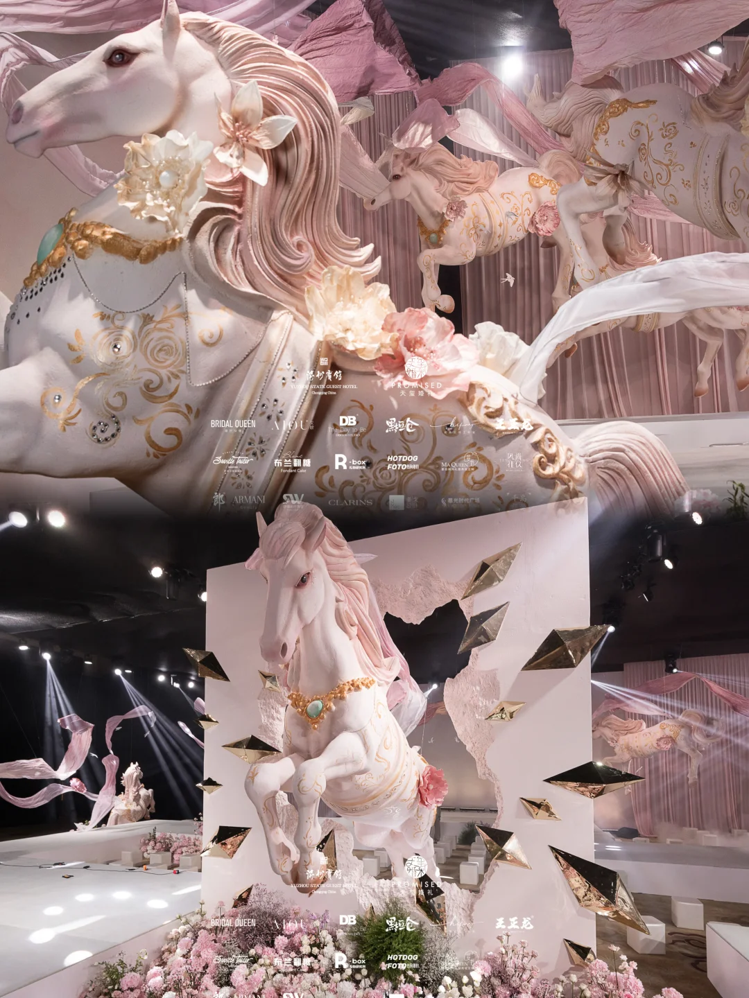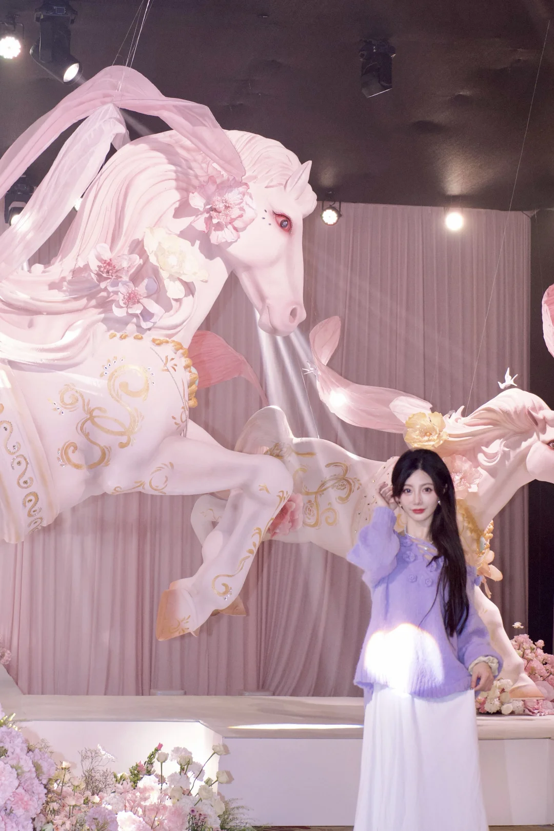 悬浮的鎏金白马带着粉纱飘带,烟雾缭绕间像闯进了中世纪童话秘境,蓝调纱裙在星光下闪着细碎的光,连空气里都飘着浪漫的味道。