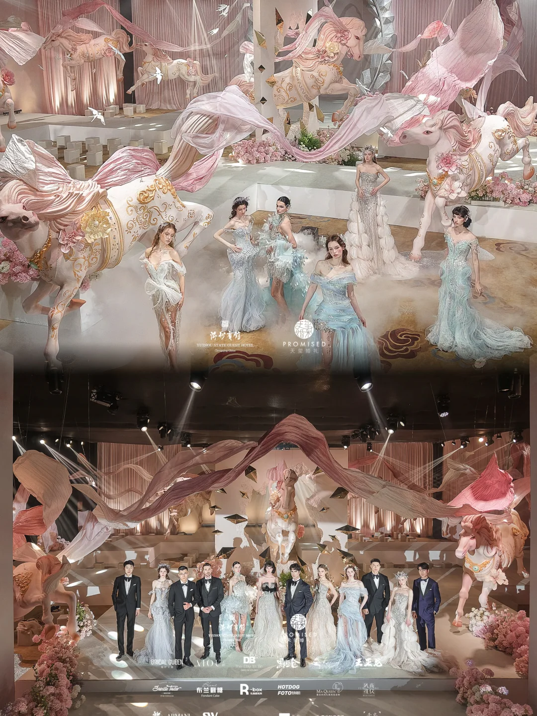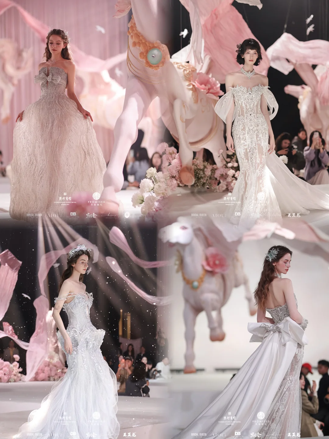 模特们踩着纱裙走过花海,每一个转身都让我忍不住感叹:女孩子一生一次的婚礼,就该这么梦幻!