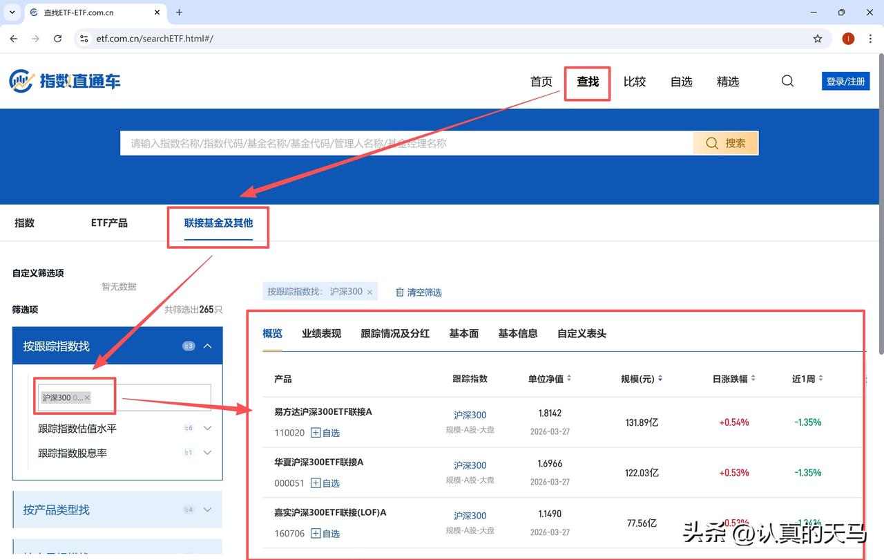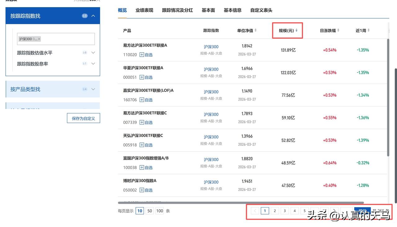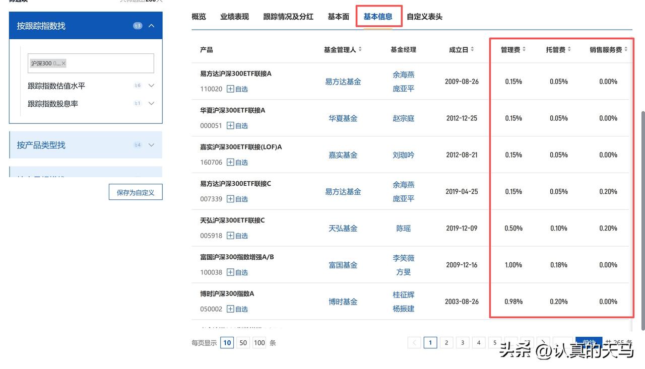 跟踪沪深300指数的基金非常多,将页面拉下来就会发现,足足有265只跟踪沪深300指数的基金。