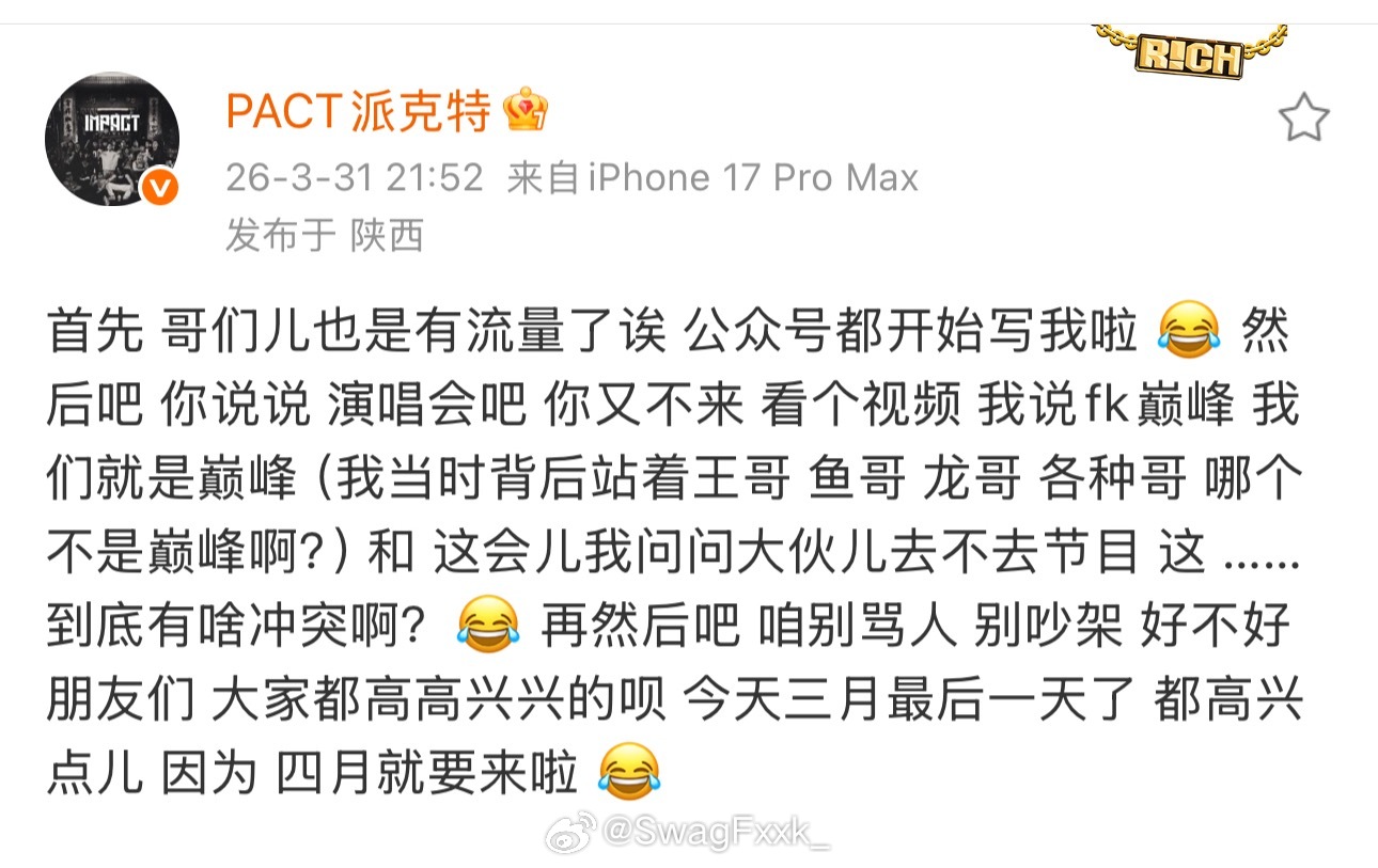 派克特回应质疑:我一直就想问 我说fk巅峰 我们就是巅峰 和节目邀请我去 到底有啥冲突?