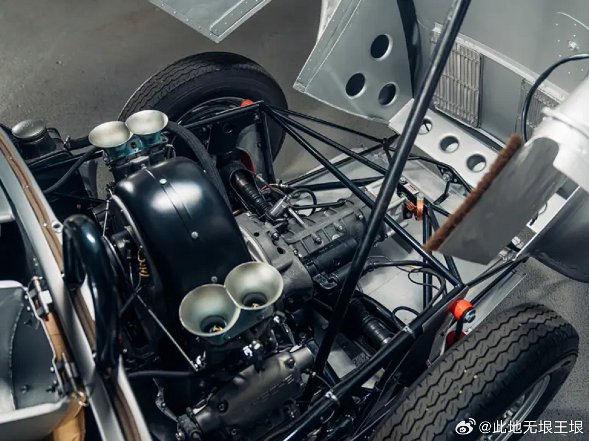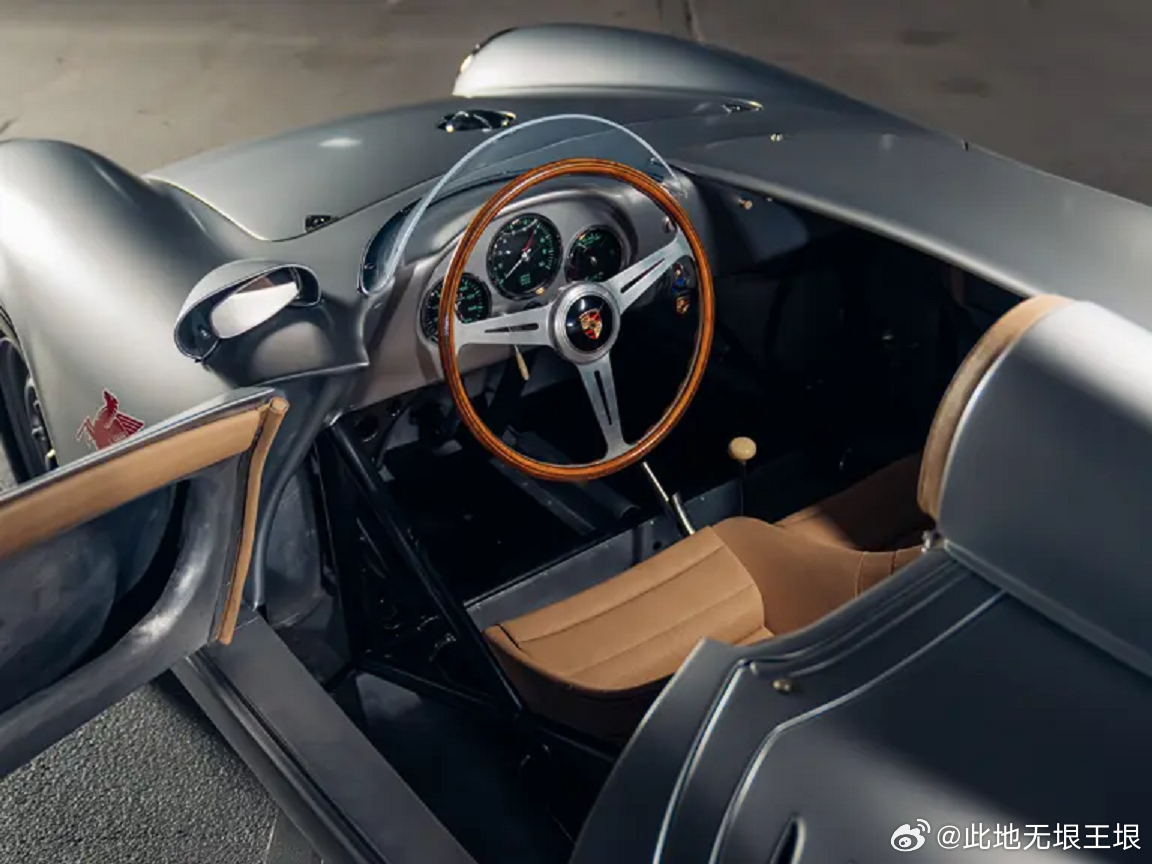 大V聊车 这是一辆极其稀有的保时捷550 A Spyder,生产于1957年。介绍保时捷550 A Spyder还要从保时捷550 Spyder说起,1952年保时捷为了备战勒芒24小时耐力赛,在保时捷356基础上开发了保时捷550 Spyder车型。保时捷550 Spyder因为钢材短缺,而大量使用铝材制作车身,加之娇小的车体,造就了仅有550公斤的车重(550 Spyder名字并非车重,而是立项的编号)。量产的保时捷550 Spyder动力配备了来自大众的排量1.5升风冷4缸发动机,功率117马力,中置后驱布局,0-100公里/小时加速时间7秒,极速250公里/小时。1953年勒芒24小时耐力赛的1101-1500毫升组别赛车中,保时捷550 Spyder包揽前两名,比赛总成绩排名15、16,力压一众排量更大、级别更高的赛车一战成名,所以有了“巨人杀手”的名号。保时捷550 A Spyder是保时捷550 Spyder的改进款车型,550 A弃用了550的梯形车架,取而代之的是更为轻量化的钢管编织车架,也因此减轻了27公斤车重。同时,保时捷550 A Spyder换装了更紧凑的水平对置4缸发动机,功率来到135马力,在之后的赛事中也让它进一步巩固了“巨人杀手”的地位。保时捷在1953年至1956年共生产了90辆550 Spyder,而后的550A Spyder仅生产了40辆。