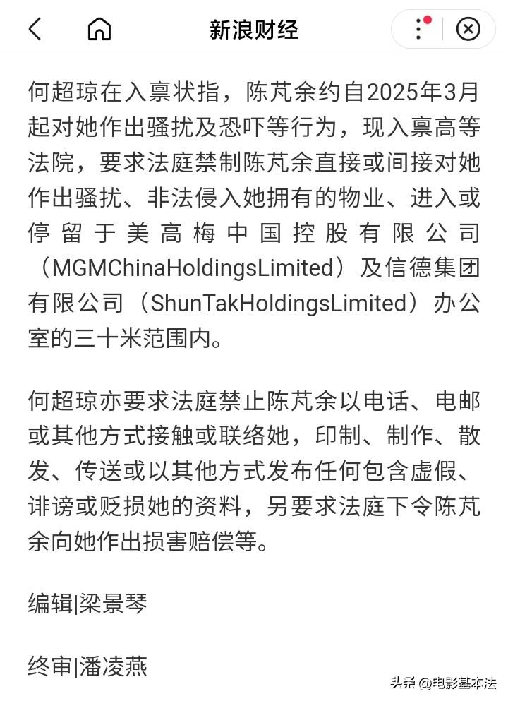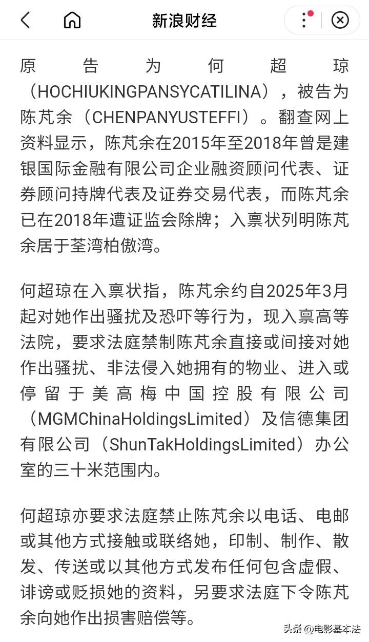 难以置信,澳门知名爱国富豪居然被一名女性恐吓和骚扰长达一年,这位富豪正是63岁的何超琼,而骚扰者似乎也并非泛泛之辈,姓名陈芃余,性别女,曾经担任建银国际前企业融资顾问持牌代表、证券顾问持牌代表、证券交易代表,2018年遭证监会除牌,目前居住于香港荃湾柏傲湾。 很难想象,一位香港女性居然有胆量敢去骚扰何超琼,而且居然有能力接近何超琼,要知道何超琼可不是普通人,按理以她的身份地位和年龄还有智慧,不会因为钱卷入是非,而且对方也是女性,那么也不可能因为感情卷入是非。 目前暂不清楚陈芃余这么做的原因和动机,但可以肯定,她必然将面临法律的严惩,因为忍无可忍之下何超琼已经把陈芃余告上法庭,陈芃余可能并没有意识到,不是她“成功”骚扰恐吓了何超琼一年,而是何超琼忍了她一年,放过她一年。