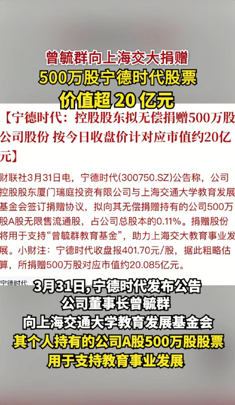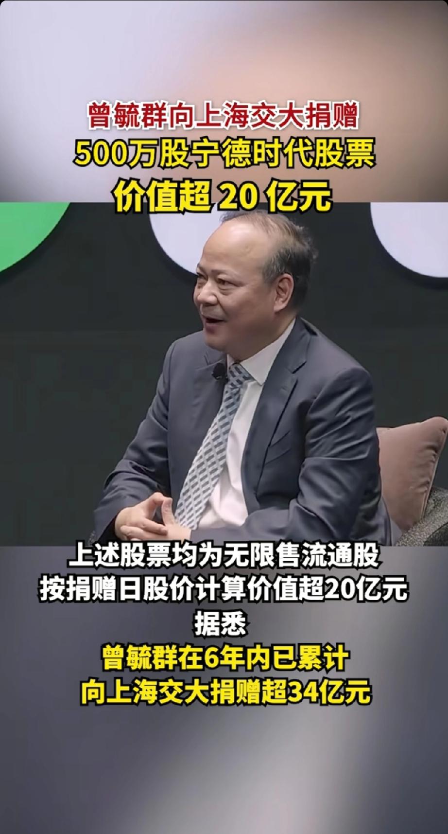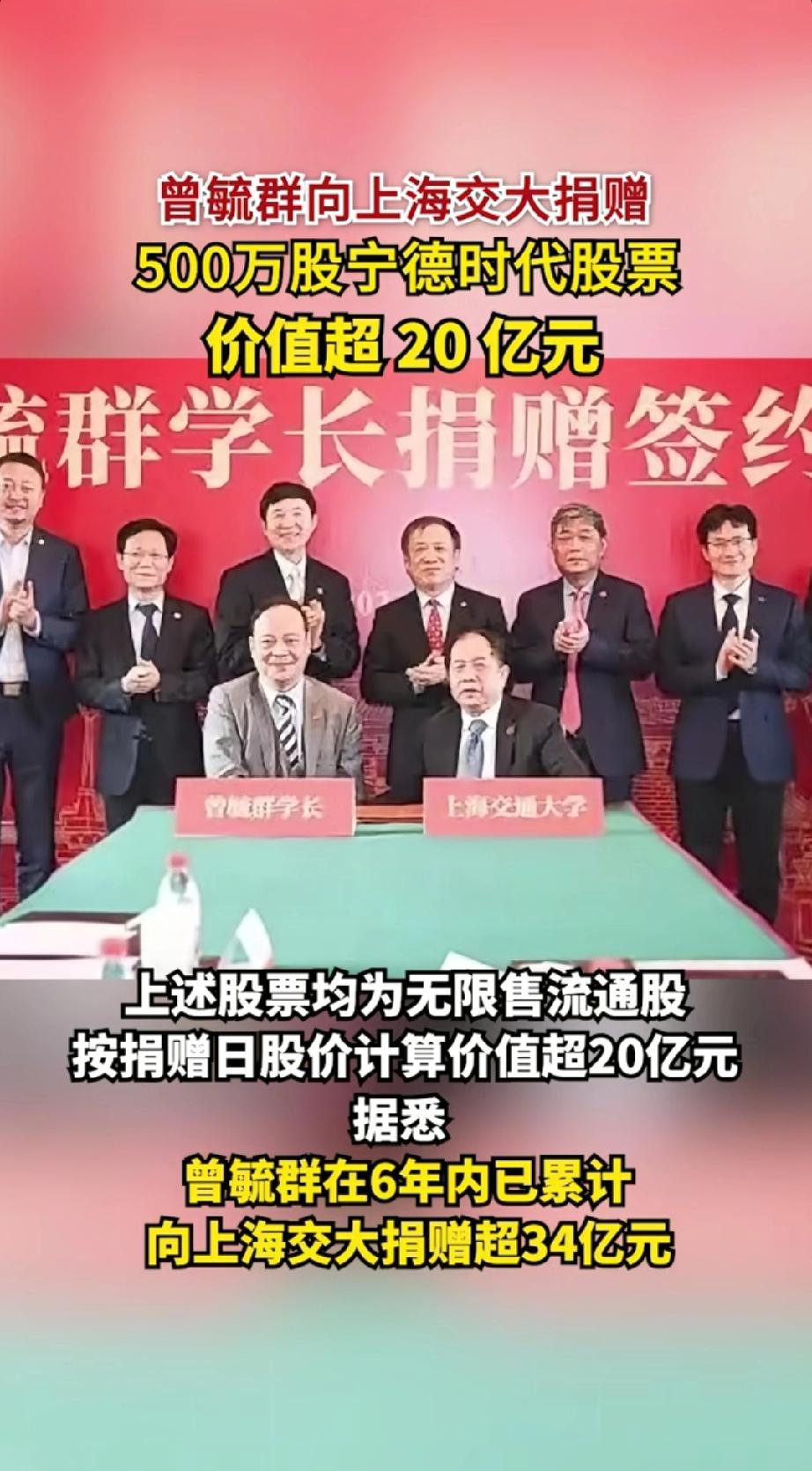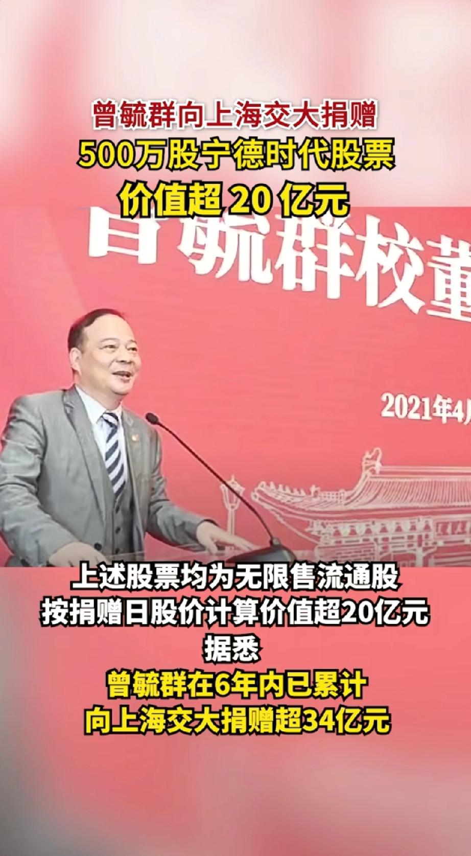 反哺母校,情系教育:曾毓群四年累计向上海交大豪捐近34亿元。 3月31日,宁德时代发布重磅公告,公司控股股东、实控人曾毓群通过旗下厦门瑞庭投资有限公司,与上海交通大学教育发展基金会签署捐赠协议,拟无偿捐赠所持有的500万股宁德时代A股无限售流通股,以支持母校教育事业发展。按当日收盘价401.7元/股计算,这笔捐赠市值高达20.085亿元。这并非曾毓群首次大手笔回馈母校,短短四年多时间,他已累计向上海交大捐赠近34亿元,成为国内高校校友捐赠的标杆典范。 一、再捐20亿,刷新母校捐赠纪录 此次捐赠的500万股股份,占宁德时代总股本的0.11%,相关股份及产生的全部收益将专项注入“曾毓群教育基金”,用于上海交大人才培养、学科建设、科研创新等核心领域 。作为上海交大1989届船舶工程专业校友,曾毓群此次捐赠再度刷新了母校单笔捐赠纪录,也彰显了其对母校发展的鼎力支持。 厦门瑞庭投资为曾毓群实际控制企业,此次捐赠后,其对宁德时代的持股比例将从22.45%微调至22.34%,但不会影响公司控制权与日常运营 。业内评价,以股票形式进行大额捐赠,既体现了捐赠人的诚意与实力,也能通过长期股权收益为高校发展提供稳定资金支持。 二、四年累计近34亿,反哺之路持续深耕 这不是曾毓群第一次向母校“雪中送炭”,其感恩回馈早已形成体系化布局: - 2021年4月:上海交大125周年校庆之际,曾毓群受聘担任校董,并捐资设立“曾毓群教育基金”,为后续深度合作奠定基础。 - 2021年12月:通过宁波瑞庭投资捐赠200万股宁德时代股票,按当时687元/股股价计算,市值约13.74亿元,彼时创下中国高校第三大单笔捐赠纪录,也成为上海交大史上最大捐赠。 - 2026年3月:再度捐赠500万股,市值超20亿元,四年累计捐赠金额逼近34亿元。 三、不止于资金:产学研深度绑定,共筑科创高地 除巨额资金支持外,曾毓群与上海交大的合作早已延伸至产学研全链条,实现教育与产业的双向赋能: - 科研共建:2020年,宁德时代与上海交大签署协议,共建清洁能源技术联合研究中心,聚焦新能源、动力电池等前沿领域攻关。 - 人才共育:2021年上海交大未来技术学院成立,曾毓群受聘担任名誉院长,学院开设的可持续能源方向与宁德时代主业高度契合,定向培养行业领军人才。 - 资源共享:依托双方优势,推动科研成果快速转化,助力上海交大打造世界一流学科,同时为宁德时代输送顶尖技术与人才,形成“高校育才、企业用才、反哺高校”的良性循环。 四、饮水思源:企业家的家国情怀与责任担当 从交大船舶专业学子,到全球动力电池龙头企业掌门人,曾毓群始终秉持“饮水思源,爱国荣校”的校训 。其连续大额捐赠,不仅是个人对母校培养的感恩,更折射出新时代杰出企业家的家国情怀与社会责任 。 在科技创新成为国家战略的当下,校友捐赠已成为高校发展的重要支撑。曾毓群的示范效应,或将带动更多企业家关注教育、反哺母校,为中国高等教育发展与科技自立自强注入强劲动力。上海宁德时代