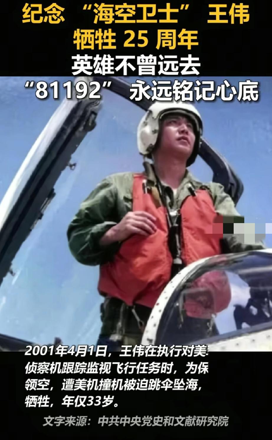 2026年4月1日,是“海空卫士”王伟烈士牺牲25周年。2001年4月1日,美军侦察机非法闯入我国海域上空,王伟驾驶编号81192的战机升空拦截,美机突然转向撞毁他的战机,他留下“我已无法返航,你们继续前进”的遗言后壮烈牺牲,年仅33岁。