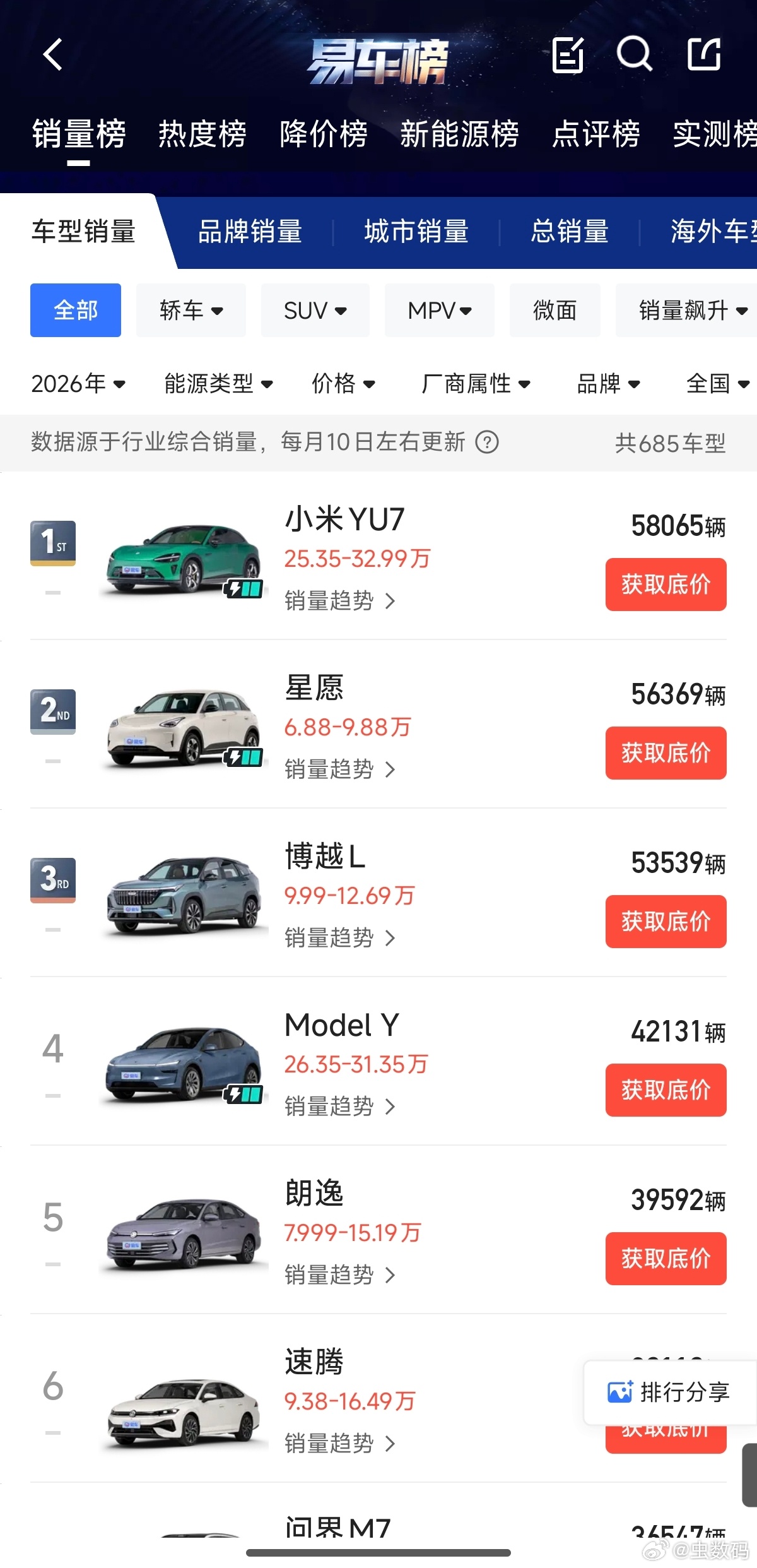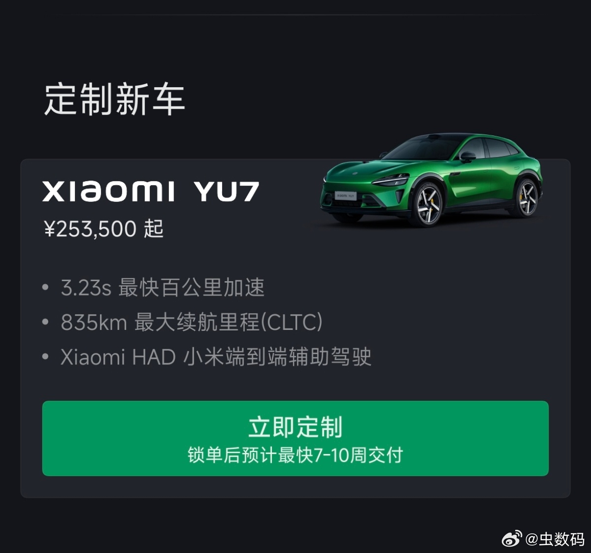 再回到YU7,确实,和去年相比好像量是少了点。但,今年受到增值税补贴影响,新能源汽车市场整体在下跌,大部分车型表现和去年相比跌了不少。而小米YU7其实表现还是不错的,1~2月总销量超过Model Y,是卖得最好的新能源SUV。而且YU7现在的提车周期仍然需要7~10周,比Model Y要长,所以,后续订单这块还是挺健康的。