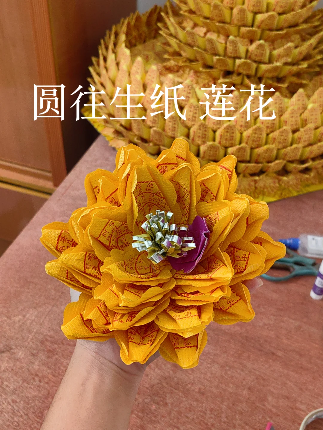 最后我用5个圆往生纸和3个溪纸折成莲花装饰
