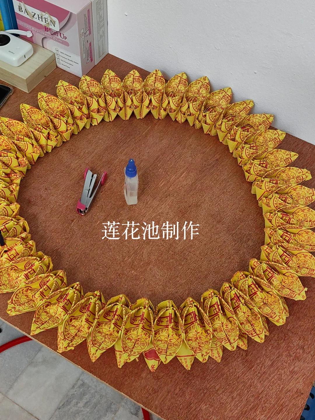 然后,里面有放路票和封条(封条贴在莲花外面),还有八卦底,我是用往生衣箱(是纸皮来的,剪成八角而已)