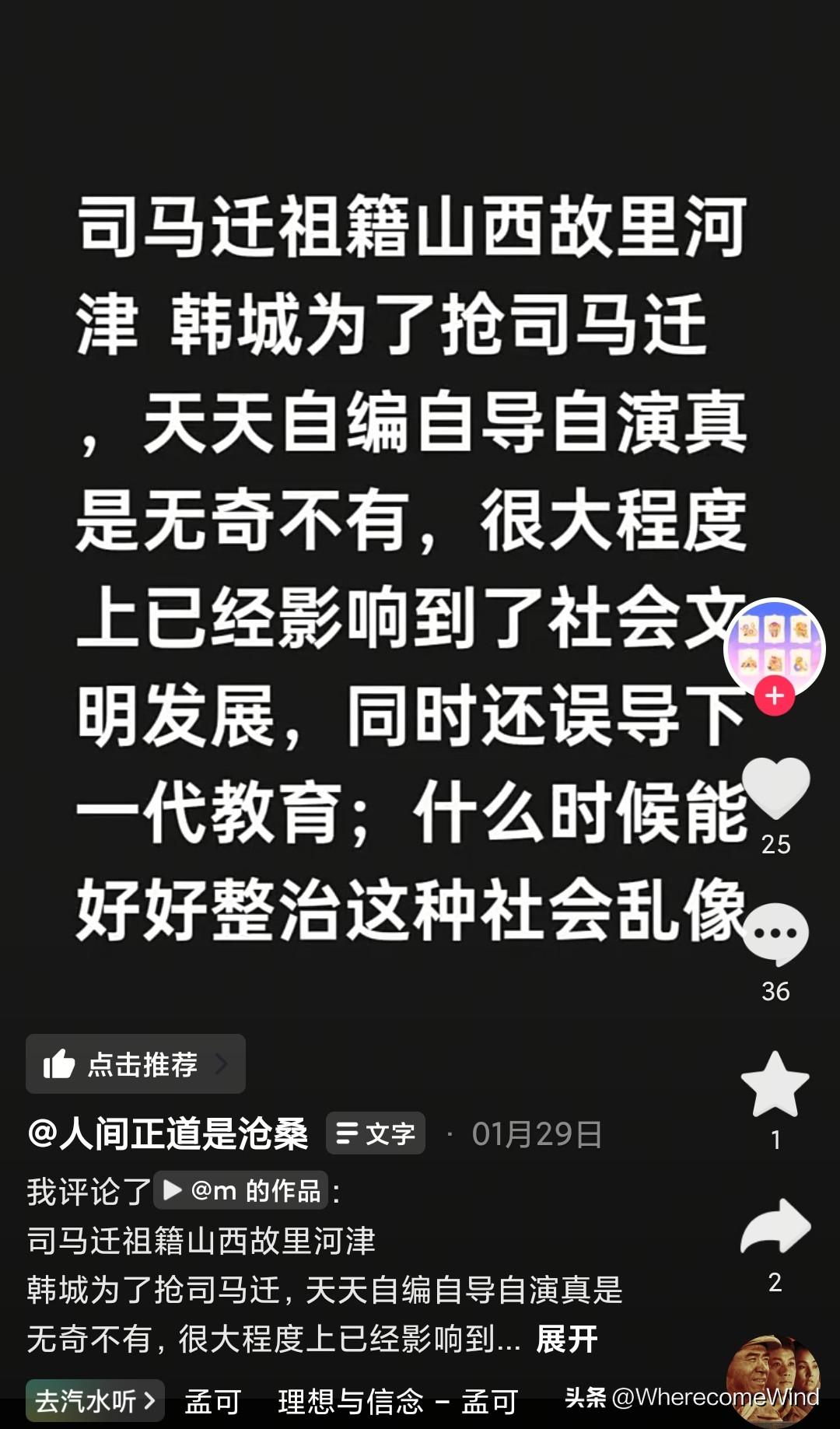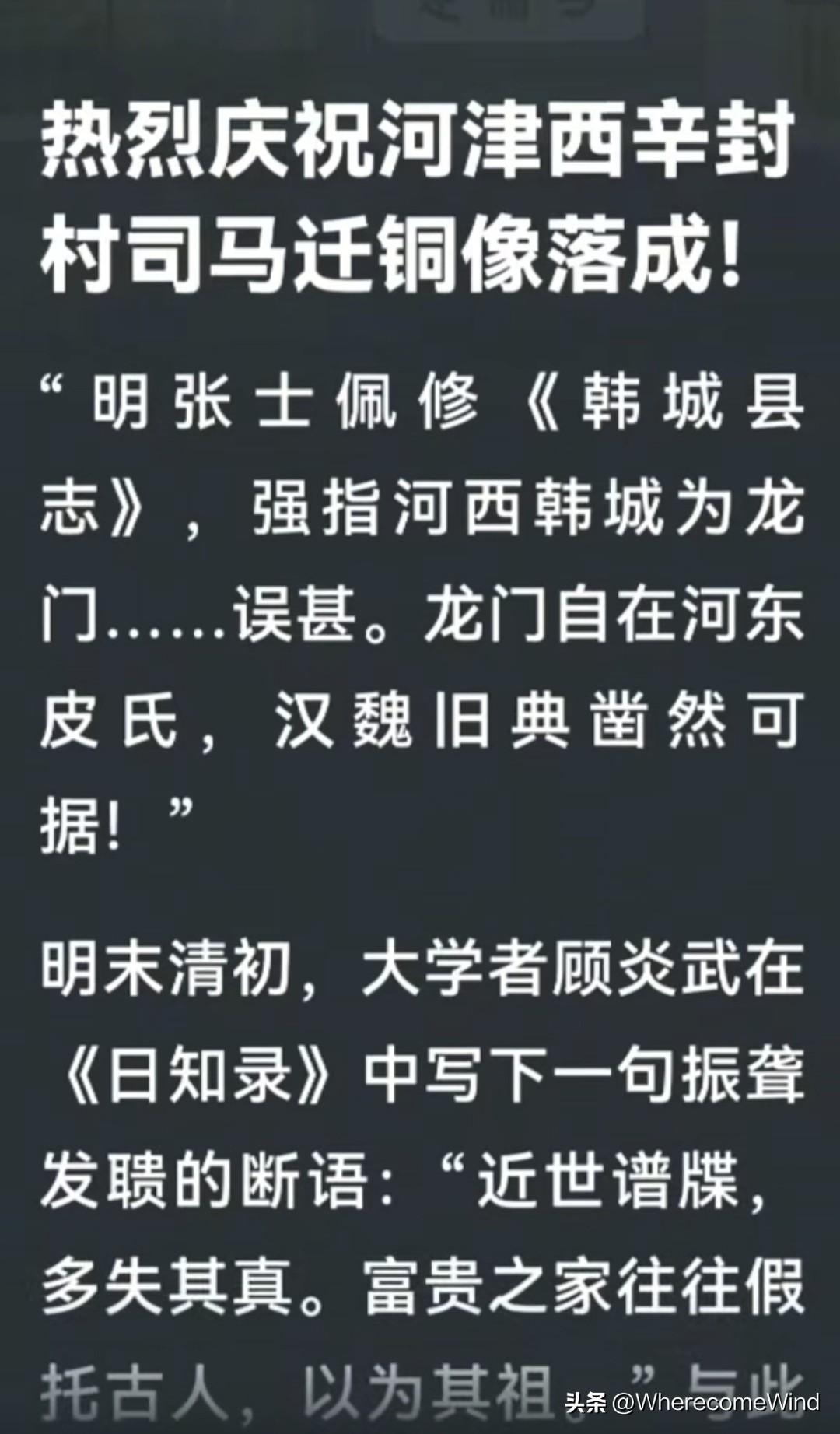司马迁故里争抢再现高潮。 迄今为止的司马迁最大铜像, 在山西河津落成。 的确现今似乎要把假的说成真的, 第一:必须把它做大, 第二,先指责别人是假的,强占舆论高点, 第三,谁的声音大,谁就有理。 司马迁到底是哪里人? 主流学界与国家权威认定为陕西韩城 。 权威定论 - 工具书:《辞海》第七版、《中国大百科全书》第三版均明确标注为西汉左冯翊夏阳(今陕西韩城)。 - 教育体系:国家统编历史与语文教材统一表述为“司马迁,陕西韩城人”。 - 文物认定:韩城司马迁祠墓为全国重点文物保护单位,是国家唯一认定的司马迁纪念地 。 核心证据 1. 行政归属:西汉时司马迁出生地属左冯翊夏阳县,即今陕西韩城;河津当时为河东郡皮氏县,两地以黄河为界。 2. 地理印证:韩城符合《史记》“迁生龙门,耕牧河山之阳”的方位描述,且唐代《括地志》等文献将龙门山明确归属于夏阳(韩城)境内。 3. 考古实证:韩城高门村发现与《史记》“葬高门”记载吻合的司马氏祖茔,为家族归葬提供直接证据。 4. 传承有序:韩城自西晋起即建祠纪念,形成延续千年的祭祀传统,证据链完整。 争议辨析 “河津说”主要依据明清方志、家谱及后世传说,但其核心前提存在时空错位:河津在汉代名为皮氏县,北魏才改名为龙门县,与司马迁自述的“龙门”时代不符。两地争议本质是“历史真实”与“地方文化认同”的差异。 综上,从国家权威、文献与考古多重互证看,司马迁为陕西韩城人是学界与官方的共识。