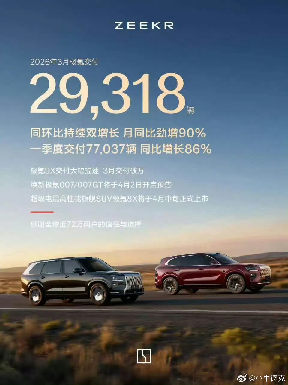 截至目前,除了几届之外,新势力厂商都已经公布了3月份的销量。由高到低分别是:零跑:50029辆理想:41053辆蔚来:35486辆极氪:29318辆小鹏:27415辆小米:20000+辆岚图:15019辆智己:7187辆 极石:1480辆