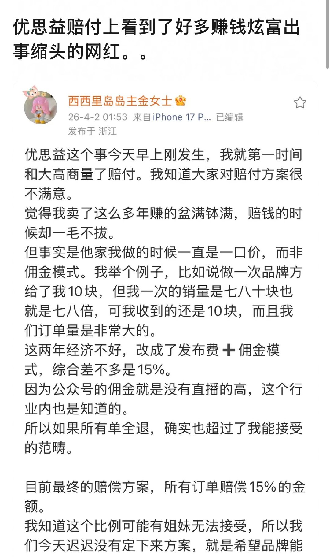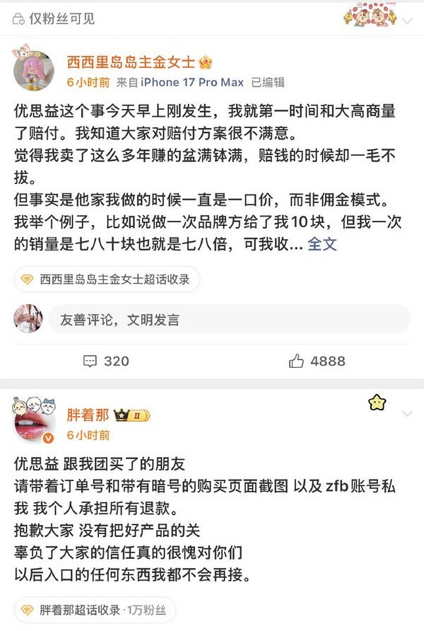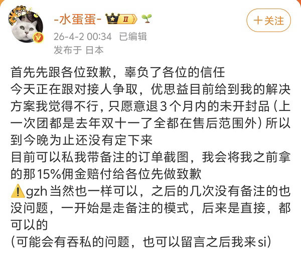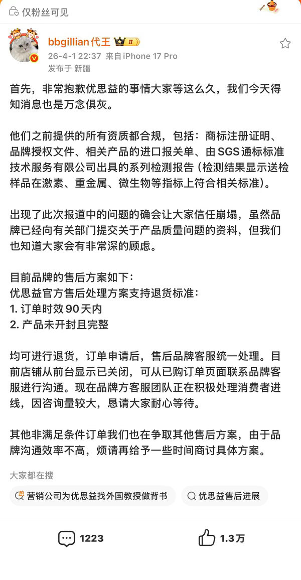 关注的博主几乎都带货过优思益这款护眼丸,事发后,道歉和处理解决模板也一样,90天未拆封全额退,其他不负责。(唯有两个是自掏腰包给粉丝做全赔处理)