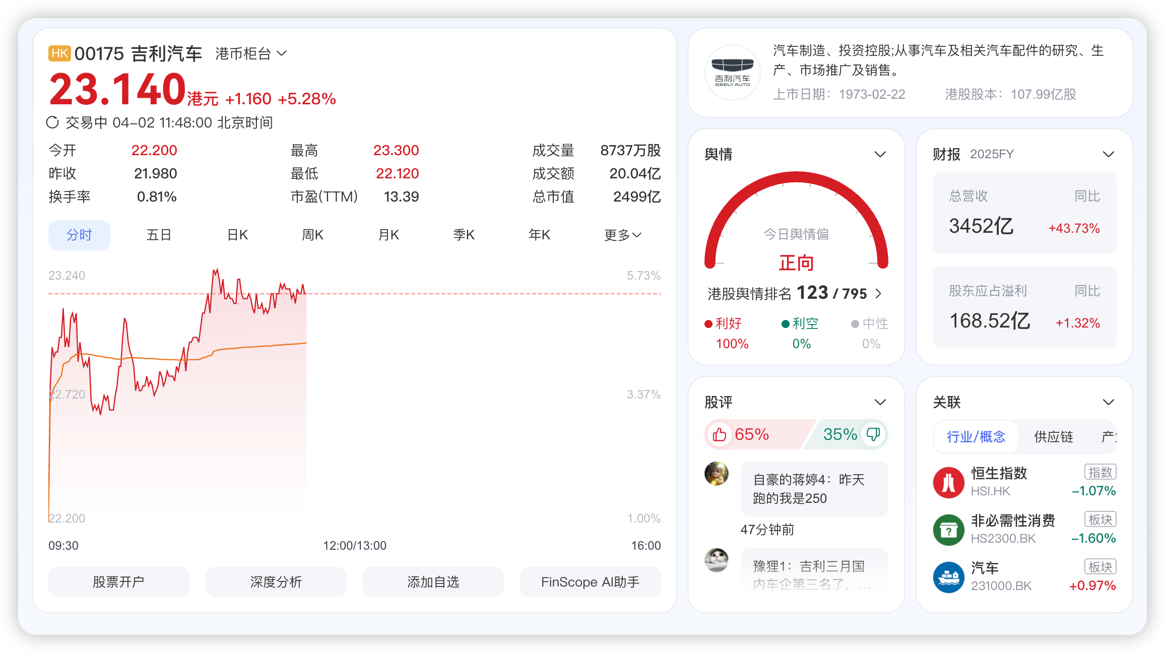 吉利大涨 吉利股票涨的也太猛了,近一个月大涨近50%,股价创四年新高!2026