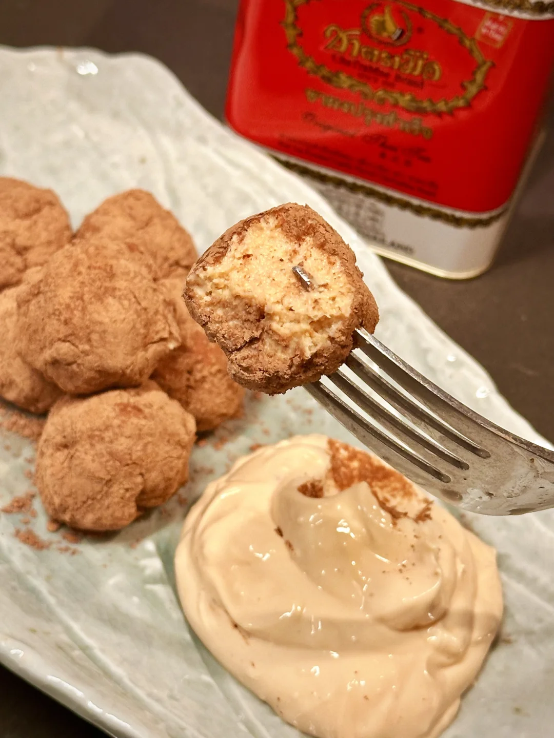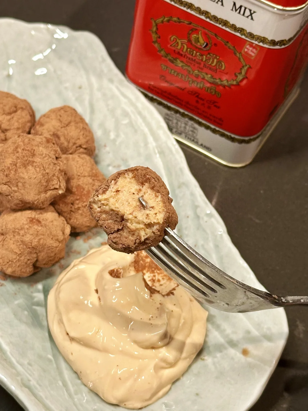 我特意让奶酪蘸酱带点微咸风味,用的奶油奶酪,因为我看到甜品届很多时候会用咸法酪(我的理解是海盐奶油奶酪和牛奶打发)和泰茶搭配。如果喜欢轻盈甘甜的,也可以用马斯卡彭~