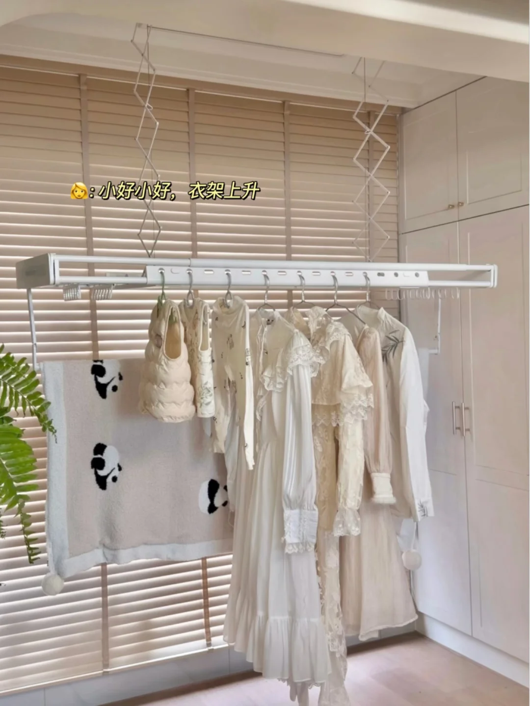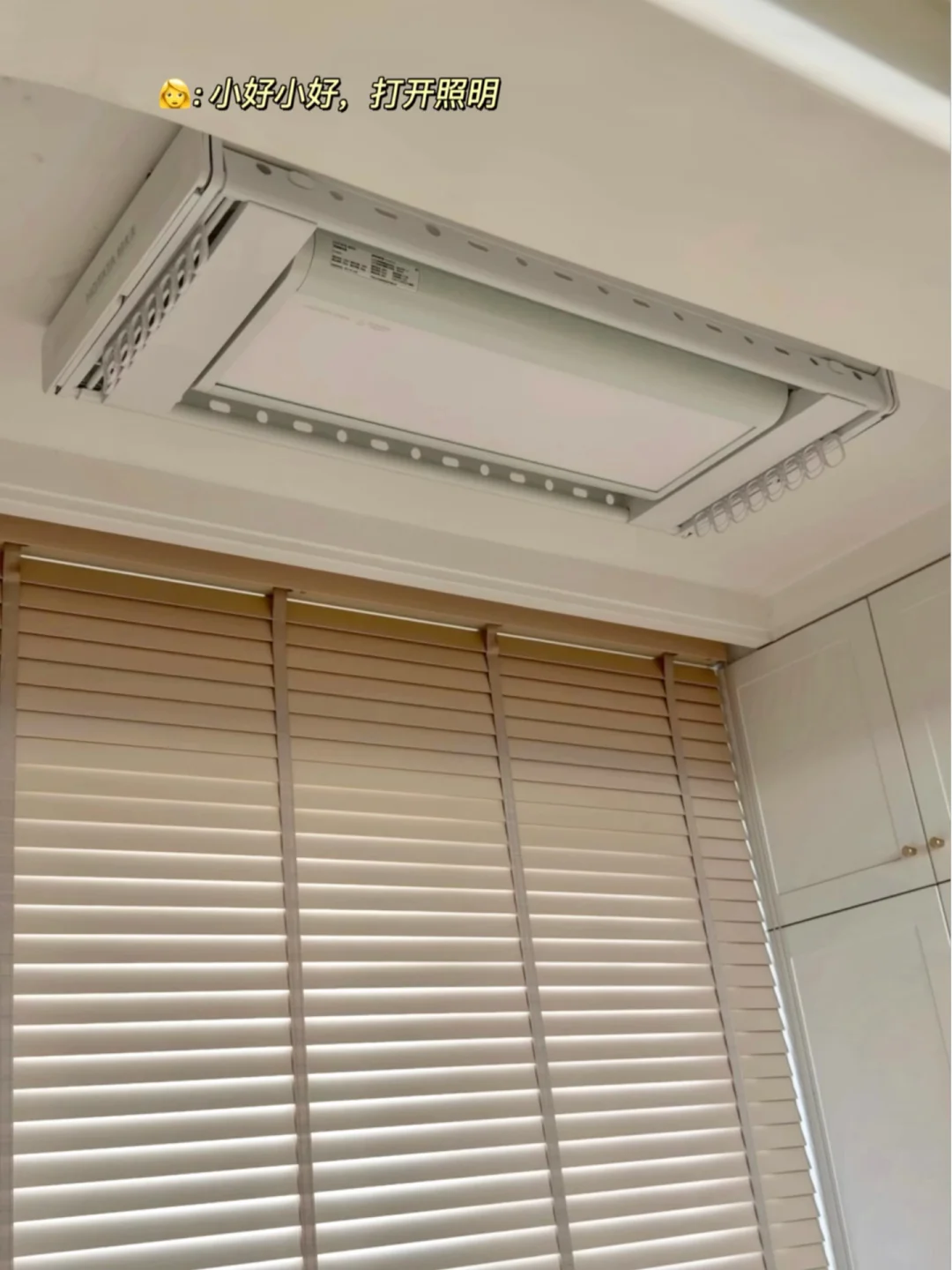 很贴心的是除了遥控和离线语音操控,晾晒衣服的时候不用湿手过去找遥控了,用的时候呼叫“小好小好,衣架上升”就可以操作了,31.5英寸大屏灯点亮光线可以照亮整个阳台