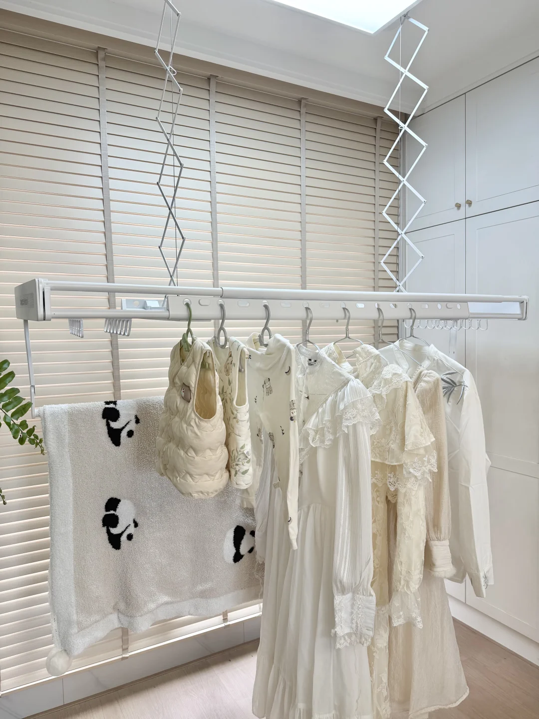拥有70斤的动态承重能力,可以同时晾晒衣服、被子,更贴心的是有专门的母婴晾晒区,母婴夹(24夹)+4根小横杆,平时晒宝宝衣服很方便!一家三口晾衣晒被互不干涉,实用拉满!