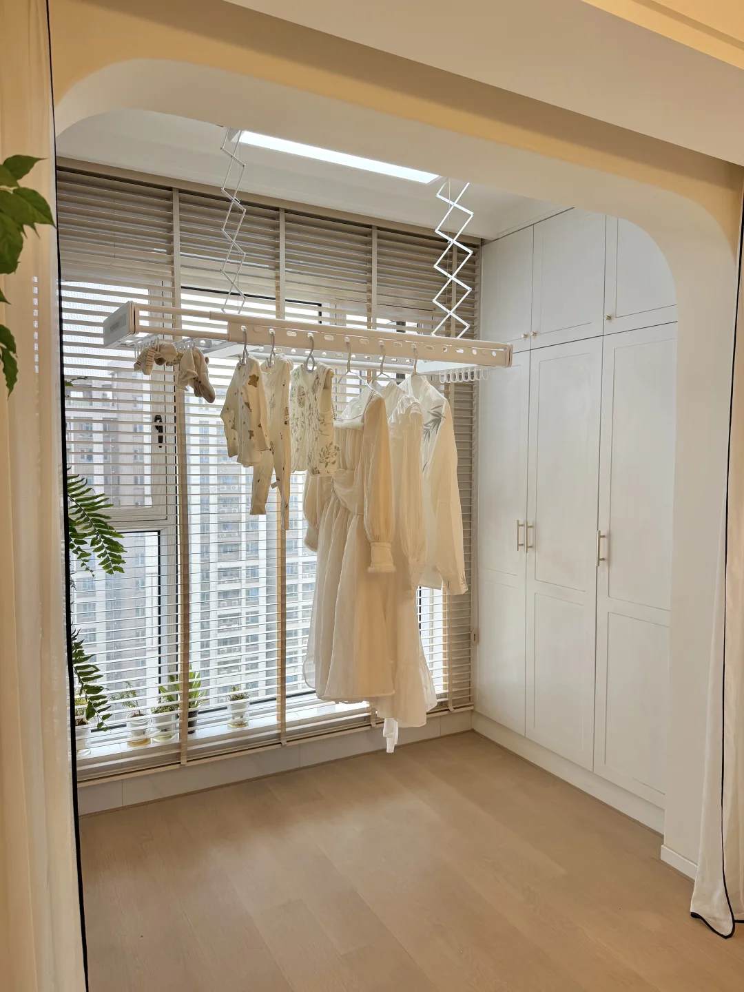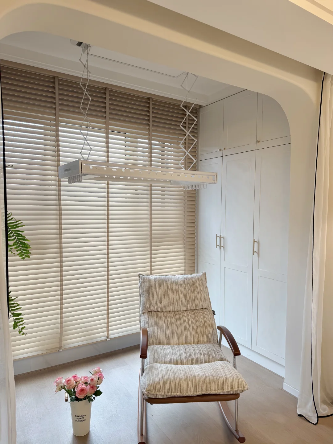 小户型阳台既想兼顾生活和休闲,电动晾衣架就可以实现,用完收起来完全隐形,大大了提升了阳台的美观程度。不用的时候收起来挂上喜欢的绿植放上摇椅,在躺椅上晒晒太阳看看书,日子简单又舒服~