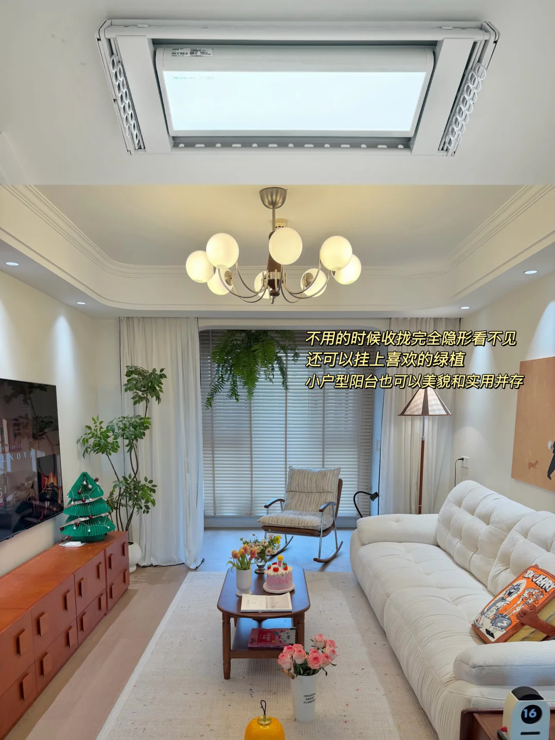 之前的笔记很多姐妹问我家在哪里晒衣服,我家阳台上方装了好太太光影小天舱智能晾衣机,整机厚度只有 10cm,安装在阳台上几乎不占地方,用完收上去在客厅完全隐形,挂上喜欢的绿植,放上摇椅阳台可以随时切换成休闲娱乐区