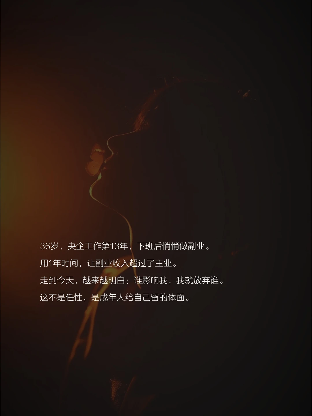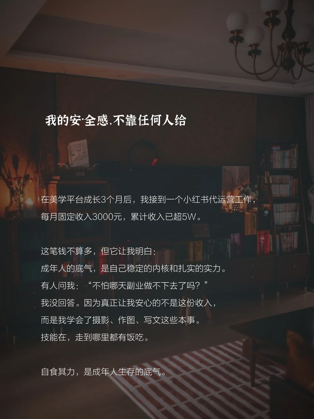 这笔钱不算多,但它让我明白:成年人的底气,是自己稳定的内核和扎实的实力。有人问我:“不怕哪天副业做不下去了吗?”我没回答。因为真正让我安心的不是这份收入,而是我学会了摄影、作图、写文这些本事。技能在,走到哪里都有饭吃。