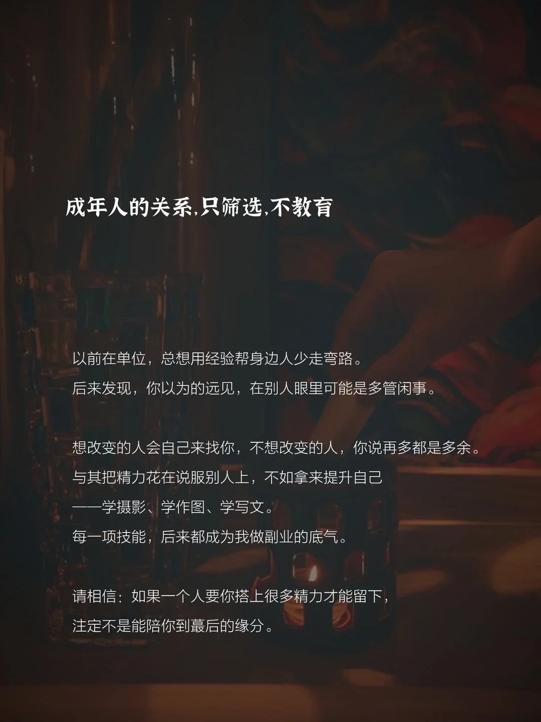 想改变的人会自己来找你,不想改变的人,你说再多都是多余。与其把精力花在说服别人上,不如拿来提升自己——学摄影、学作图、学写文。每一项技能,后来都成为我做副业的底气。