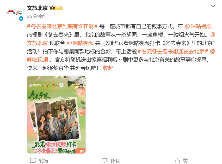 冬去春来北京到底有谁在啊 角楼、北京站、锣鼓胡同、中央电视塔,这四个地方,单拎出来每一个都是北京的名片,但今天刷到咪咕视频和文旅的联动,突然觉得把它们串在一起看,好像能看到一条时间线——从一个人来到这座城市,到在这座城市里扎下根,到抬头看见这座城市的灯火。以前觉得追剧就是追剧,现在觉得追剧也可以是追一座城市的故事。看完冬去春来想连夜去北京