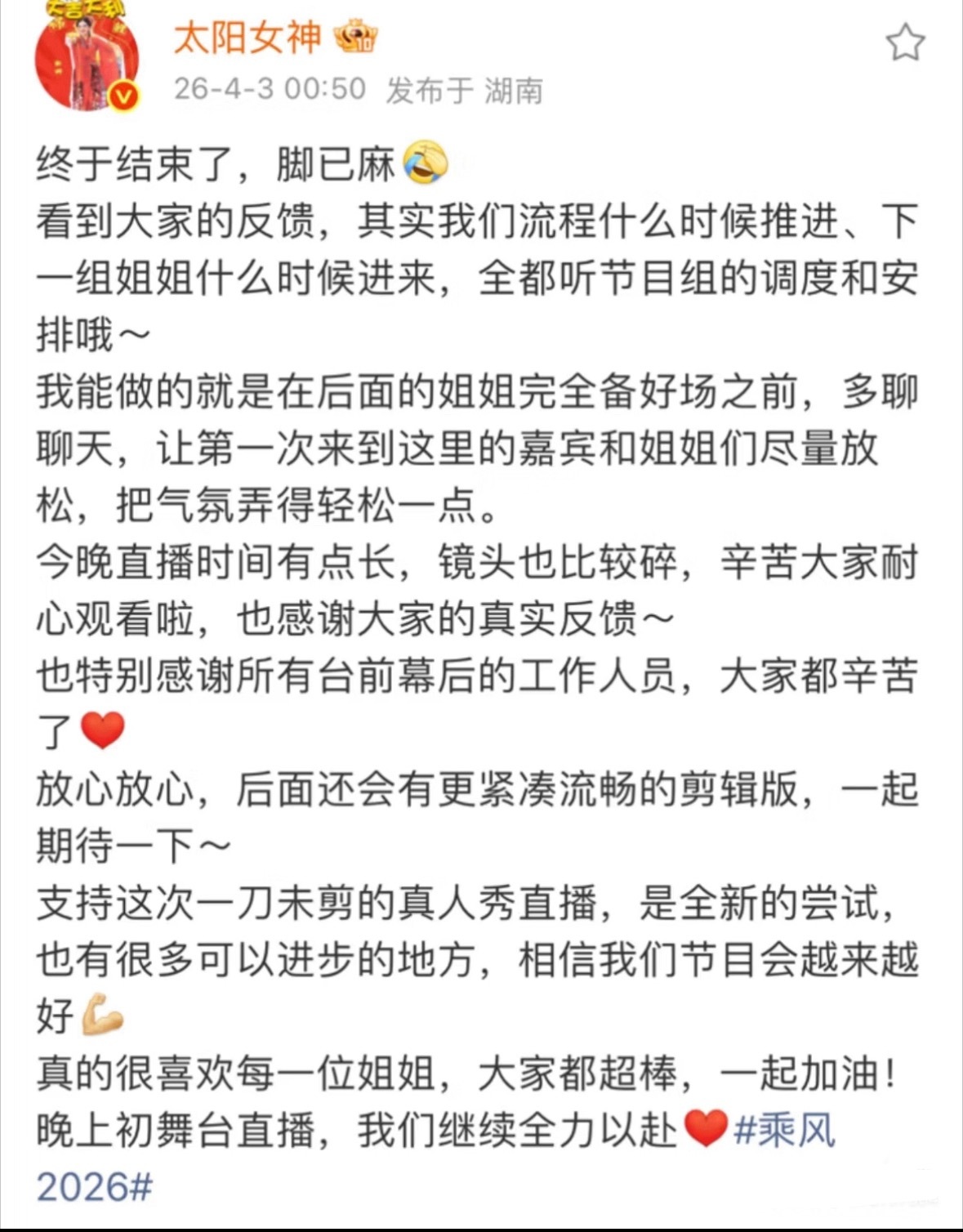 谢娜回应乘风直播节奏慢 谢娜回应浪姐直播争议这场看下来其实挺明显的,节奏和流程本身就比较混乱,但一直在努力把场子撑住的人是谢娜她要全程站着接话、找话题、缓和气氛,还得照顾每个姐姐的情绪,这种临场控场真的很考验能力直播本来就节奏慢,如果没有人一直在互动聊天,现场只会更冷场更尴尬。我觉得有她在,至少氛围是活的,也是舒服的,谢娜还特意发文安慰大家给大家说明,挺暖心的,等着后面乘风正式节目播出吧,这个是真期待了。