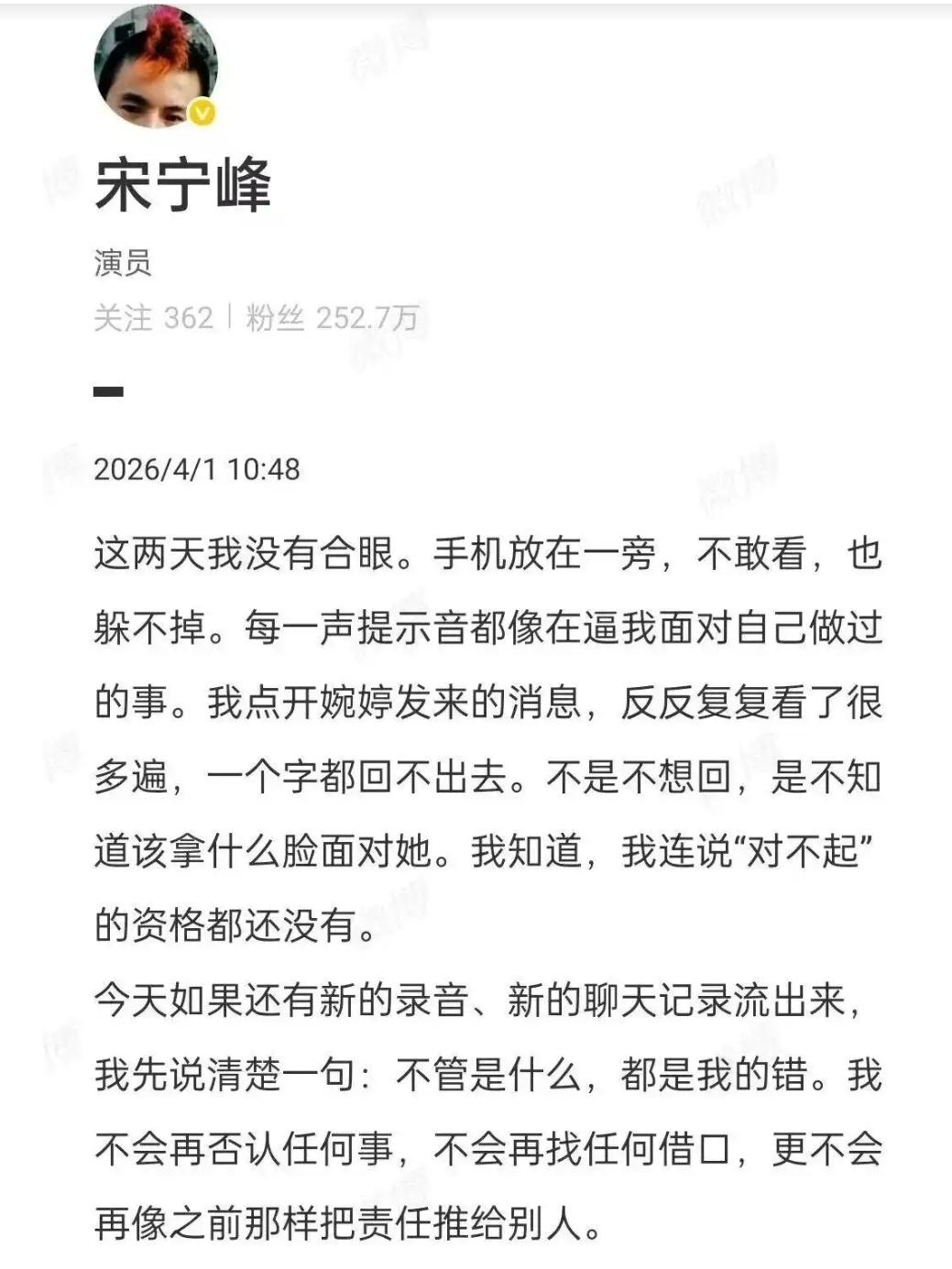 当年全网都在骂张婉婷强势、矫情, 都在心疼宋宁峰隐忍又委屈, 如今真相揭开,才知这场舆论,从头到尾都是错。 2026年4月1日,宋宁峰终于在出轨道歉长文中,亲口承认: “我一直回避问题,对她的情绪视而不见,让她陷入无尽的痛苦和自我怀疑里,是我的冷漠和背叛,让她变成了众人眼中不可理喻的样子。” 回看《再见爱人2》的名场面, 张婉婷在镜头前崩溃大哭、情绪彻底爆发, 带着满心的委屈、不安和绝望, 说话急促、情绪激动,整个人状态非常不好。 网友们只看到她的敏感、情绪化, 张口就骂她强势、不懂事、控制欲强, 却没人深究她为何会变成这样。 而一旁的宋宁峰,始终沉默以对, 满脸写着无辜与隐忍, 靠着这副模样,收获了全网的同情与偏爱。 可他从来都不是不知情。 张婉婷每一次的情绪爆发,每一次的落泪崩溃, 都不是无理取闹, 那是她察觉到婚姻里的异样, 是长期被漠视、被冷处理后,绝望的求救信号。 他比谁都清楚,妻子的敏感源于不安, 她的失控源于没有安全感, 可他偏偏选择刻意无视、持续冷漠。 一边维持着自己的深情人设, 一边用沉默不断消耗她、伤害她, 把她的痛苦当成矫情,把她的求救当成负担, 任由她在婚姻里独自挣扎,直至崩溃。 直到证据确凿,再也无法隐瞒, 他没有任何退路,才不得不承认出轨, 才在长文里,说出迟来的忏悔。 从来没有天生就情绪化的女人。 那些在婚姻里变得敏感、脆弱、情绪不稳的人, 不过是遇上了一个不够体贴、不愿沟通、缺乏担当的伴侣。 别再轻易指责一个女人的情绪, 你没见过她深夜的辗转难眠, 没体会过她不被理解的窒息感, 就没资格评判她的敏感与失控。 她所有的尖锐与不安, 从来都不是本性, 而是被最爱的人,用长久的无视与冷漠, 一点点磨出来的。