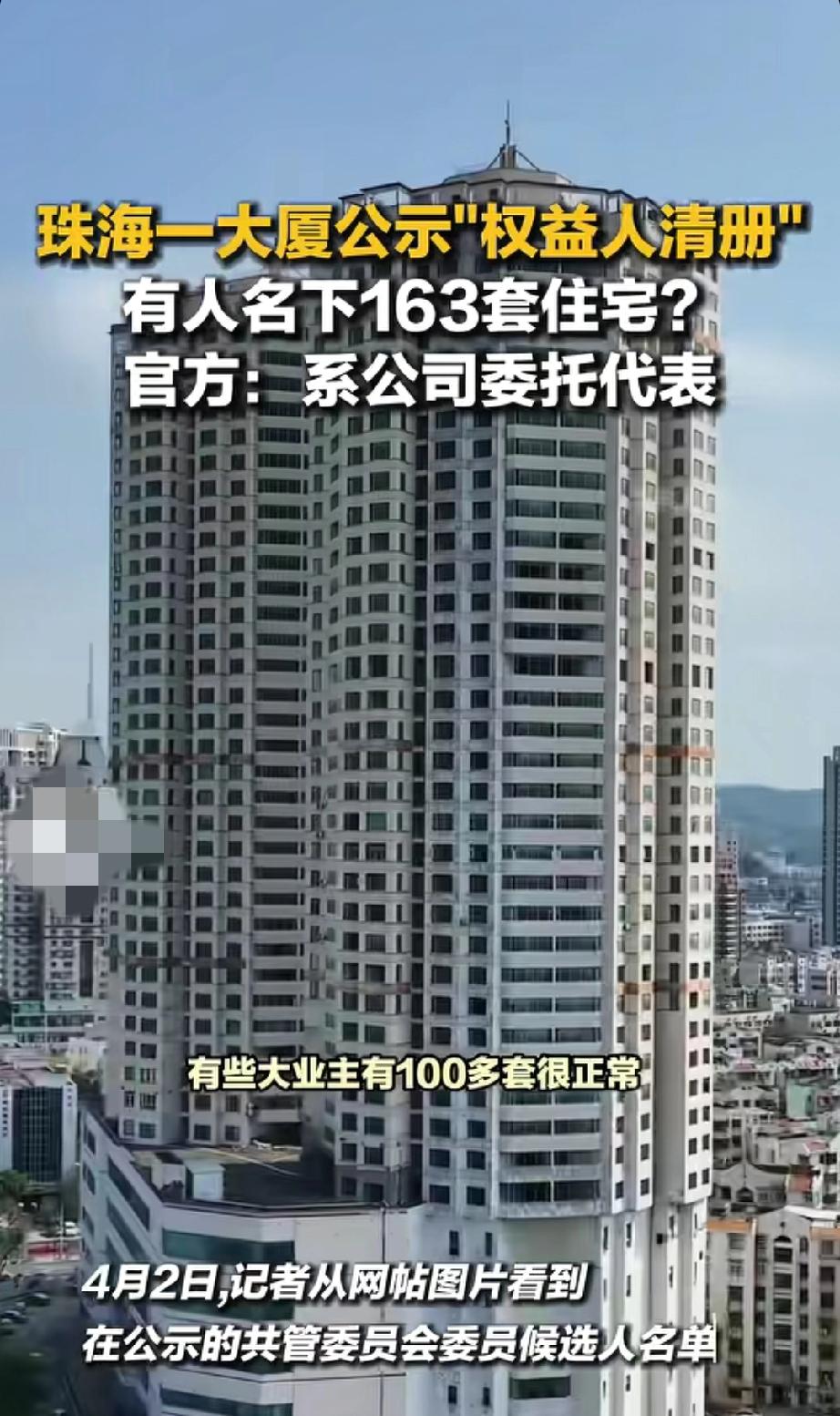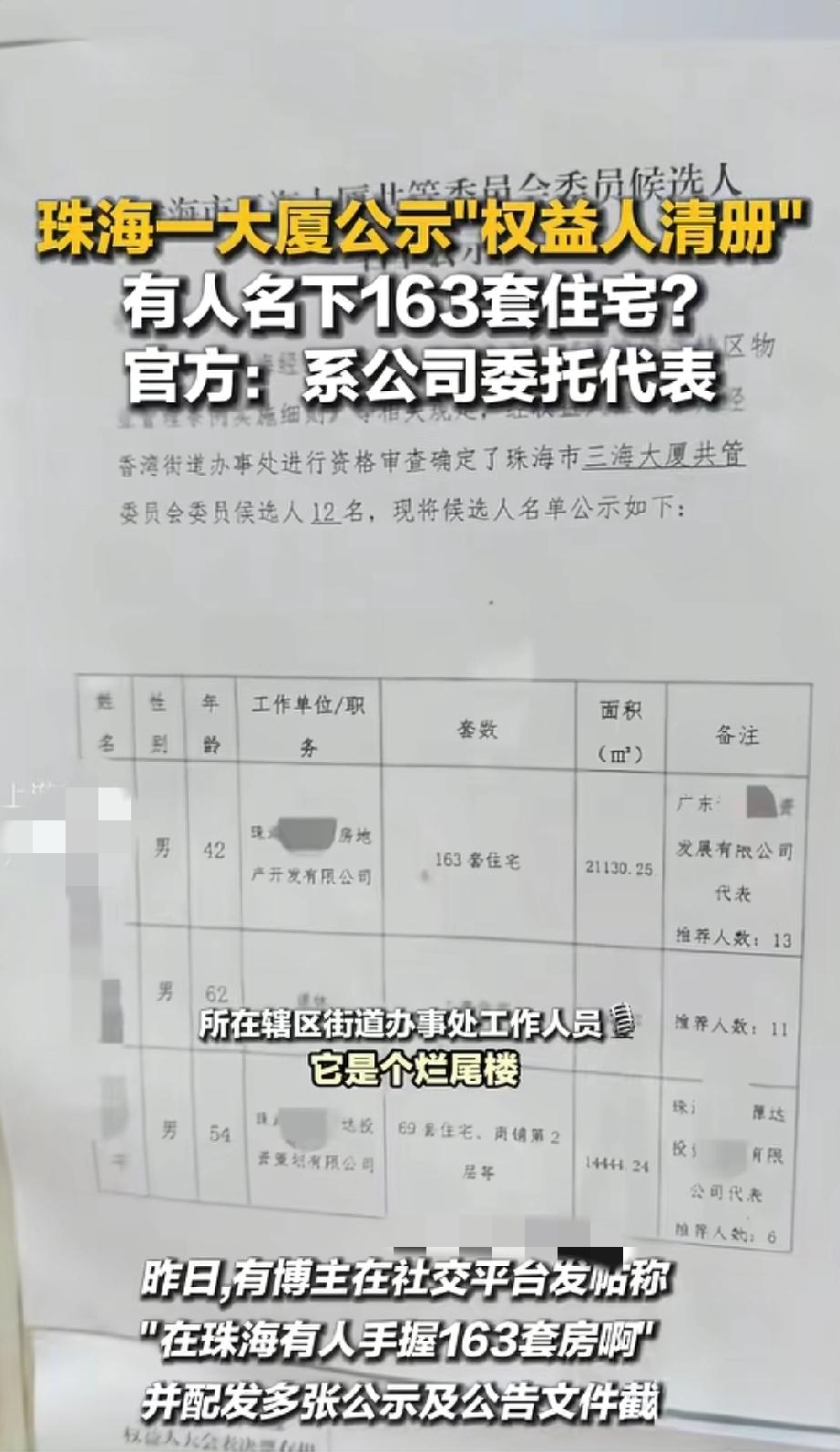 珠海一大厦公示“权益人清册”,一人名下显示163套住宅引热议,官方回应:系公司委托代表,并非个人持有,该大厦为烂尾楼拟拆除重建。 珠海三海大厦公示“权益人清册”可太炸锅了!一人名下163套住宅,总面积超2.1万平方米。要知道,普通家庭为一套房奔波半生,这差距简直天壤之别,网友们瞬间炸开了锅,各种猜测满天飞。 不过官方很快回应,这163套并非个人持有,而是广东一家投资公司的,公示候选人只是委托代表。这大厦是烂尾楼,停工近三十年,现在准备拆除重建。 这事也提醒咱,网络信息复杂,别轻信传言,得等官方通报,保持理性,才能看清真相。 珠海二手豪宅 金湾三灶房产 横琴湾三期 珠海一大厦 三期房产 珠海四化房子 珠海西区房产