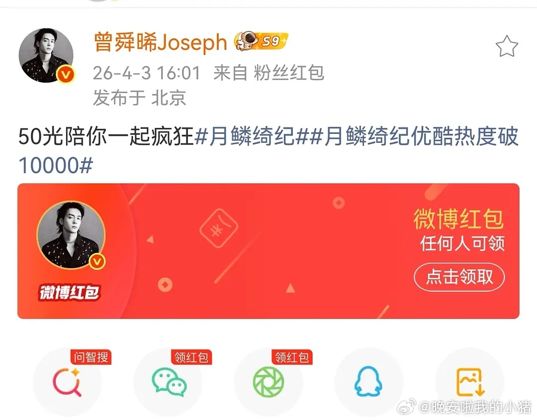 曾舜晞庆祝月鳞绮纪破万又发了3万🧧,两天发了7万剧宣🧧了,这个武拾光龙真好