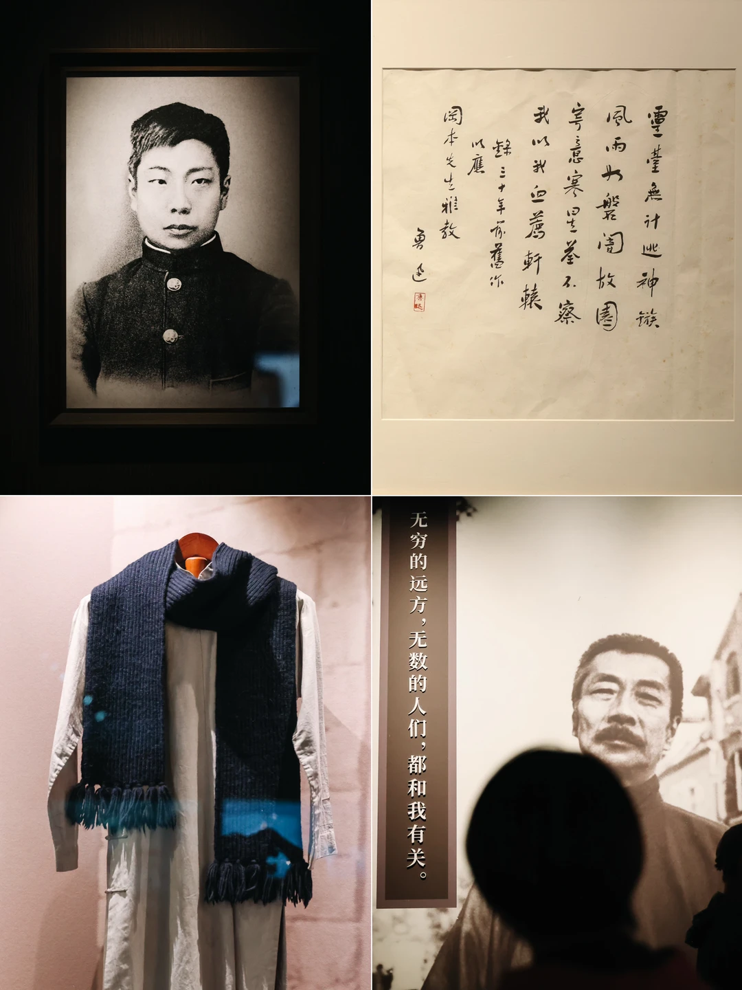 整个展览极其用心。从故乡绍兴说起,直到上海逝世,详尽介绍了先生的思想启蒙、转变、求学、救国的道路。先生的衣物、手稿、藏书、藏碑拓片、信札被规整地摆放在展柜里。更让我觉得用心的地方在于,每个章节的上方都有一句诗句作为总结:风雨飘摇日;炎天凛夜长;大江日夜向东流;我以我血荐轩辕。
