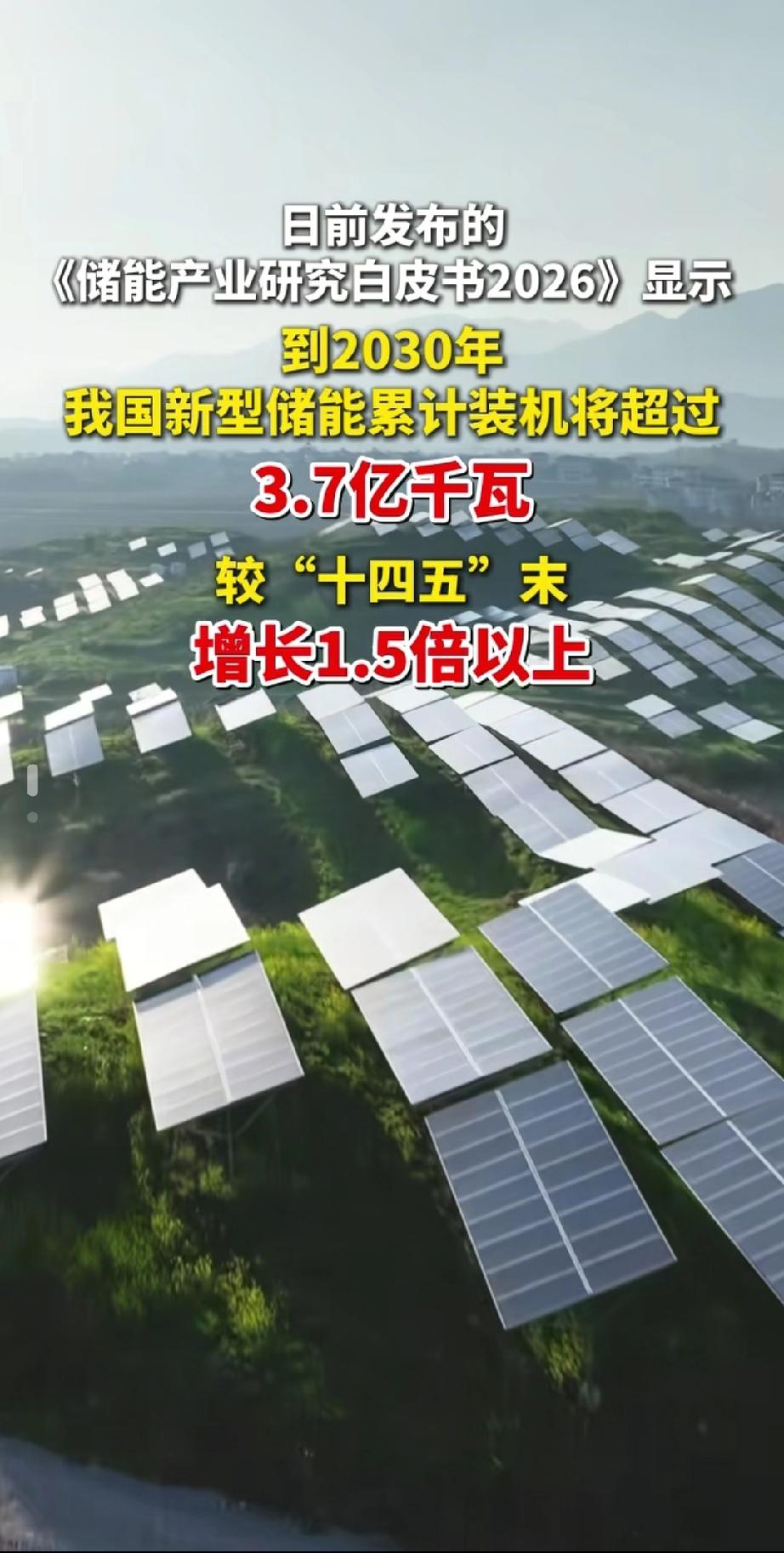 2030年我国新型储能规模将超3.7亿千瓦,这简直是能源领域的超级大变革!《储能产业研究白皮书2026》给出了明确信号。截至2025年底,全国新型储能装机就已达1.36亿千瓦,四年新增装机世界第一。“十五五”规划将其列为战略性新兴支柱产业,政策与市场双轮驱动。 保守估计2030年累计装机达371.2吉瓦,理想场景更将冲击450.7吉瓦。这3.7亿千瓦能撬动超2万亿元市场,带动上下游产业爆发,AI+储能等新赛道也将崛起,未来能源格局要被彻底重塑啦! 储能市场报告 储能企业排行 储能行业报告 储能经济 储能规划 储能产业报告 储能新规