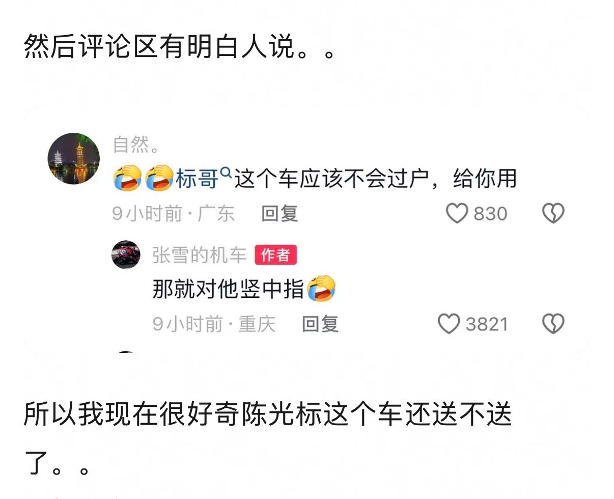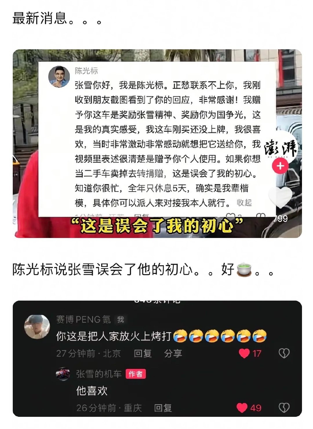 陈光标:送你加长款劳斯莱斯张雪:转手8折二手出,捐给嫣然天使基金陈光标:你误会了我的初心张雪:🖕🏻