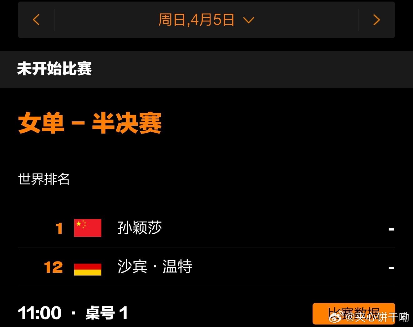 2026澳门国际乒联单打世界杯丨4月5日半决赛赛程11:00 T1 孙颖莎🇨🇳VS莎宾·温特🇩🇪13:15 T1 王楚钦🇨🇳VS雨果·卡尔德拉诺🇧🇷孙颖莎王楚钦比赛加油,健康完赛